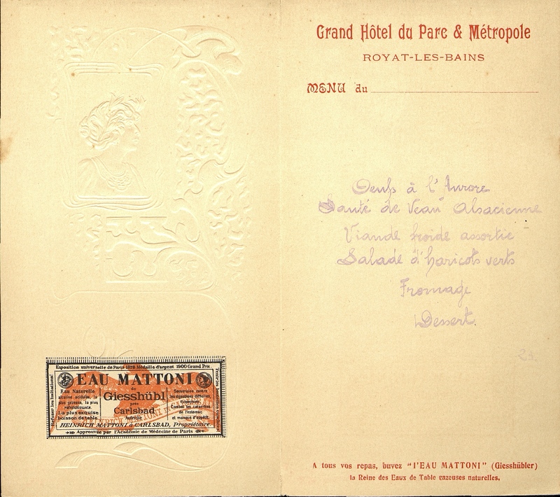 Plats servis : Œuf à l'Aurore. Sauté de Veau Alsacienne. Viande froide assortie. Salade de Haricots verts. Fromage. Dessert.
