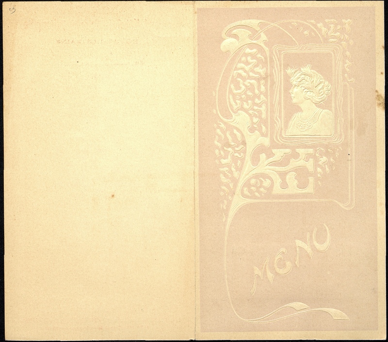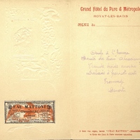 Illustration : portrait en buste d'une femme aux fleurs dans les cheveux Art Nouveau nacre sur fond parme. Manuscrit et portant un timbre publicitaire pour l'Eau Mattoni de Giesshübl prés Carlsbad en Autriche.