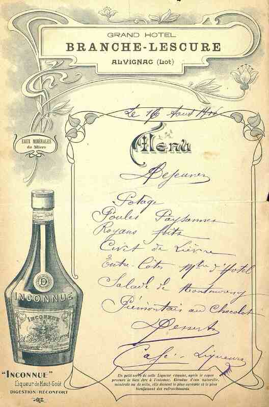 Illustration : Publicité pour les Eaux minérales de Miers et la liqueur "Inconnue" de Sarlat-en-Périgord.