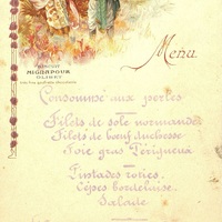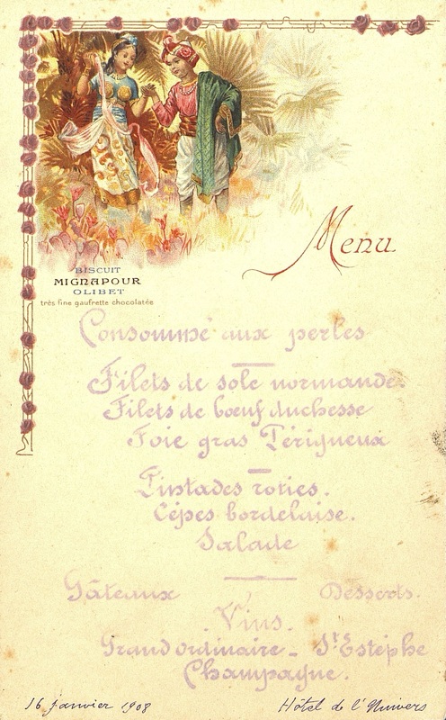 Plats servis : Consommé aux perles. Filets de sole Normande. Filets de bœuf duchesse. Foie gras Périgueux. Pintades rôties. Cèpes bordelaise. Salade. Gâteaux. Desserts.