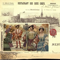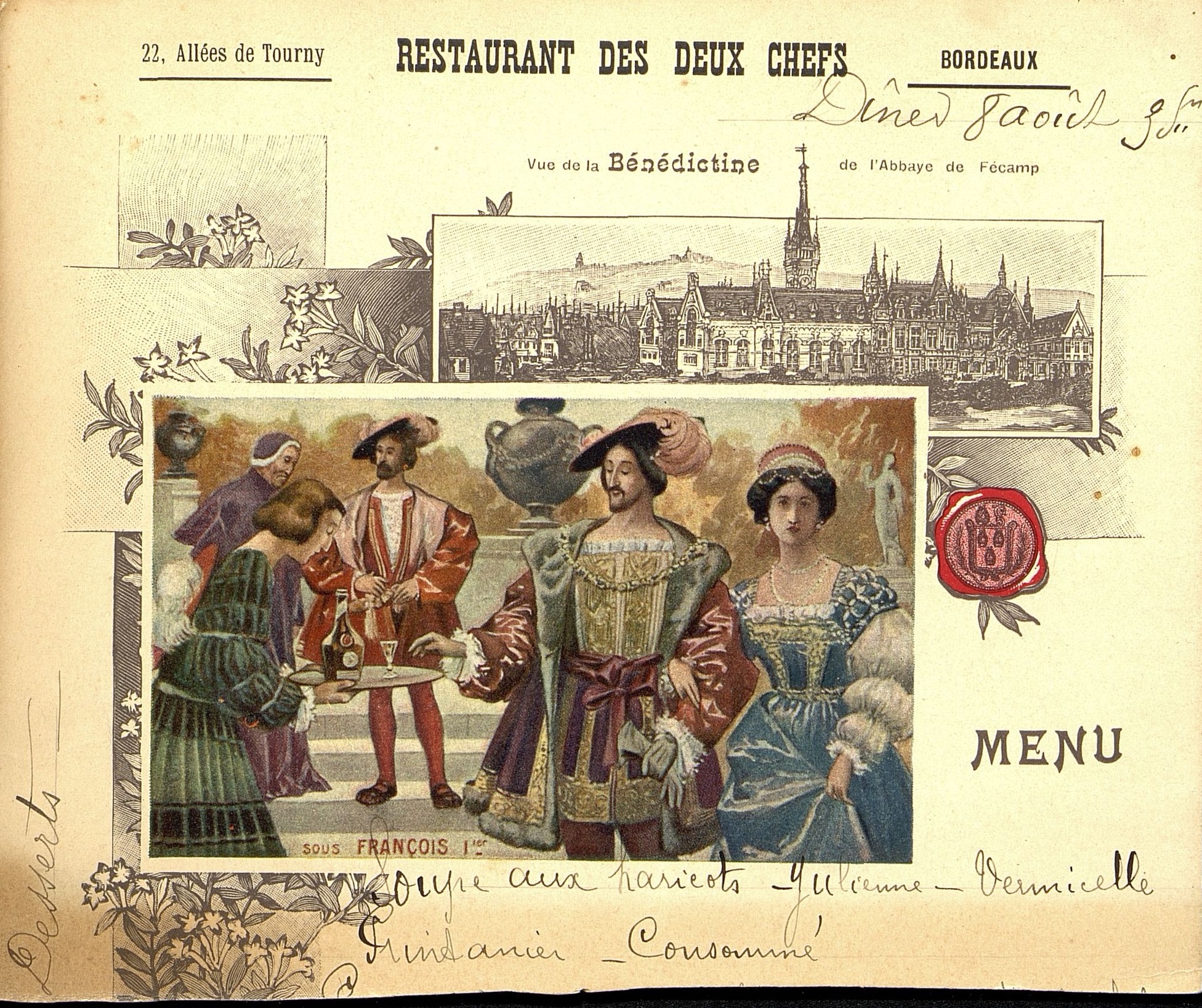 Menu déchiré et incomplet du Restaurant des Deux Chefs à Bordeaux. Illustré d'une image avec François Ier. Vue de l'Abbaye de Fécamp.