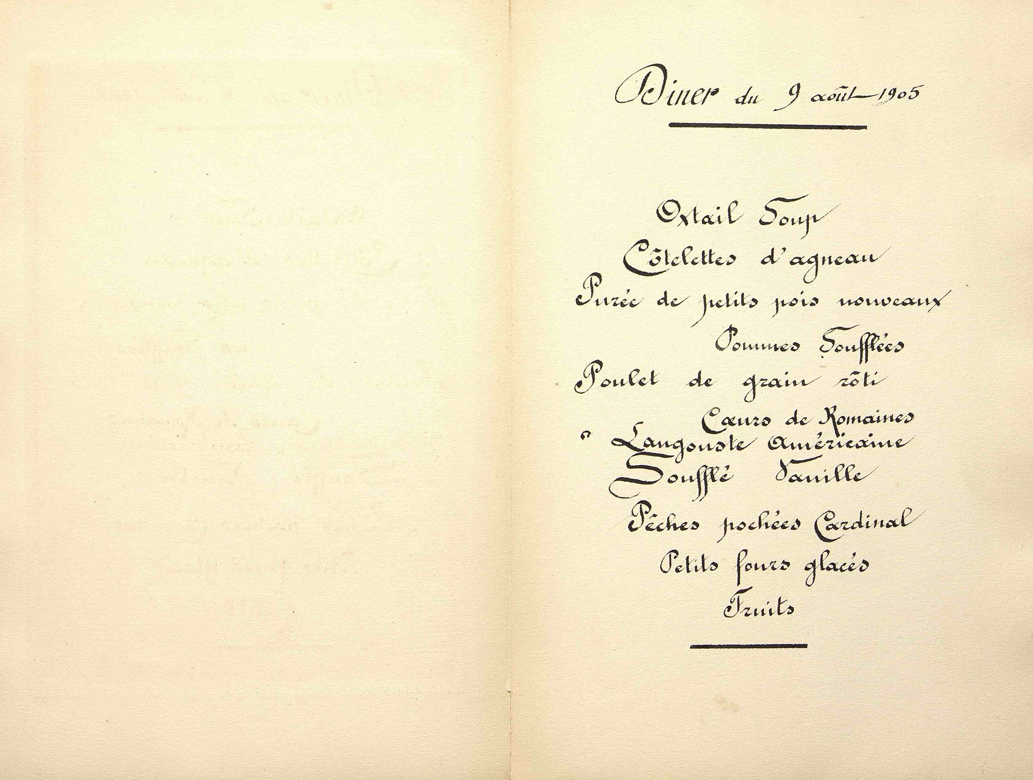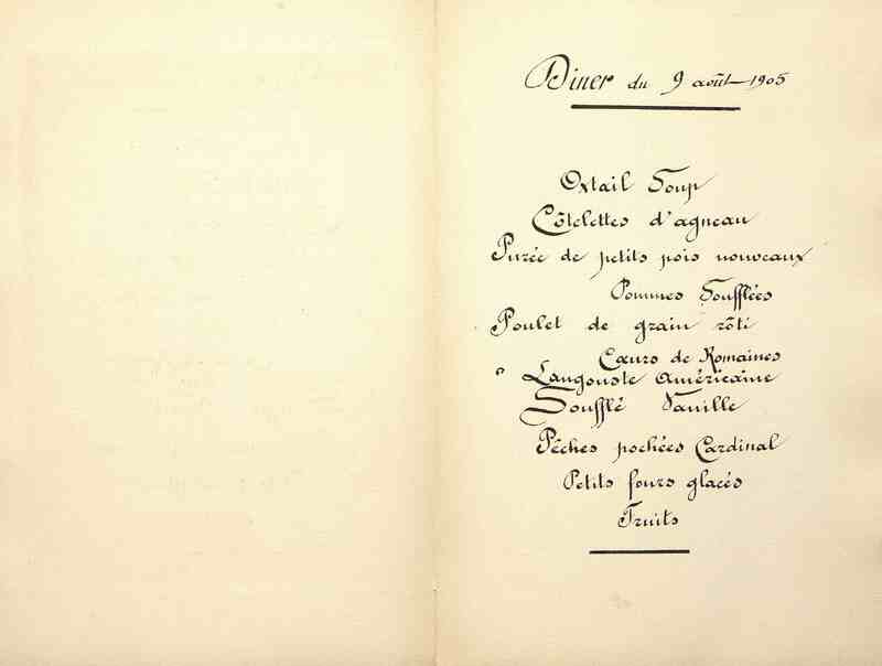 Plats servis : Oxtail Soup. Côtelettes d'agneau. Purée de petits pois nouveaux. Pommes soufflées. Poulet de grain rôti. Cœurs de Romaines. Langouste Américaine. Soufflé Vanille. Pêches pochées Cardinal. Petits fours glacés. Fruits.