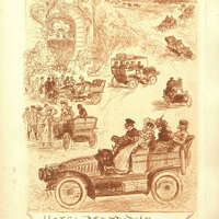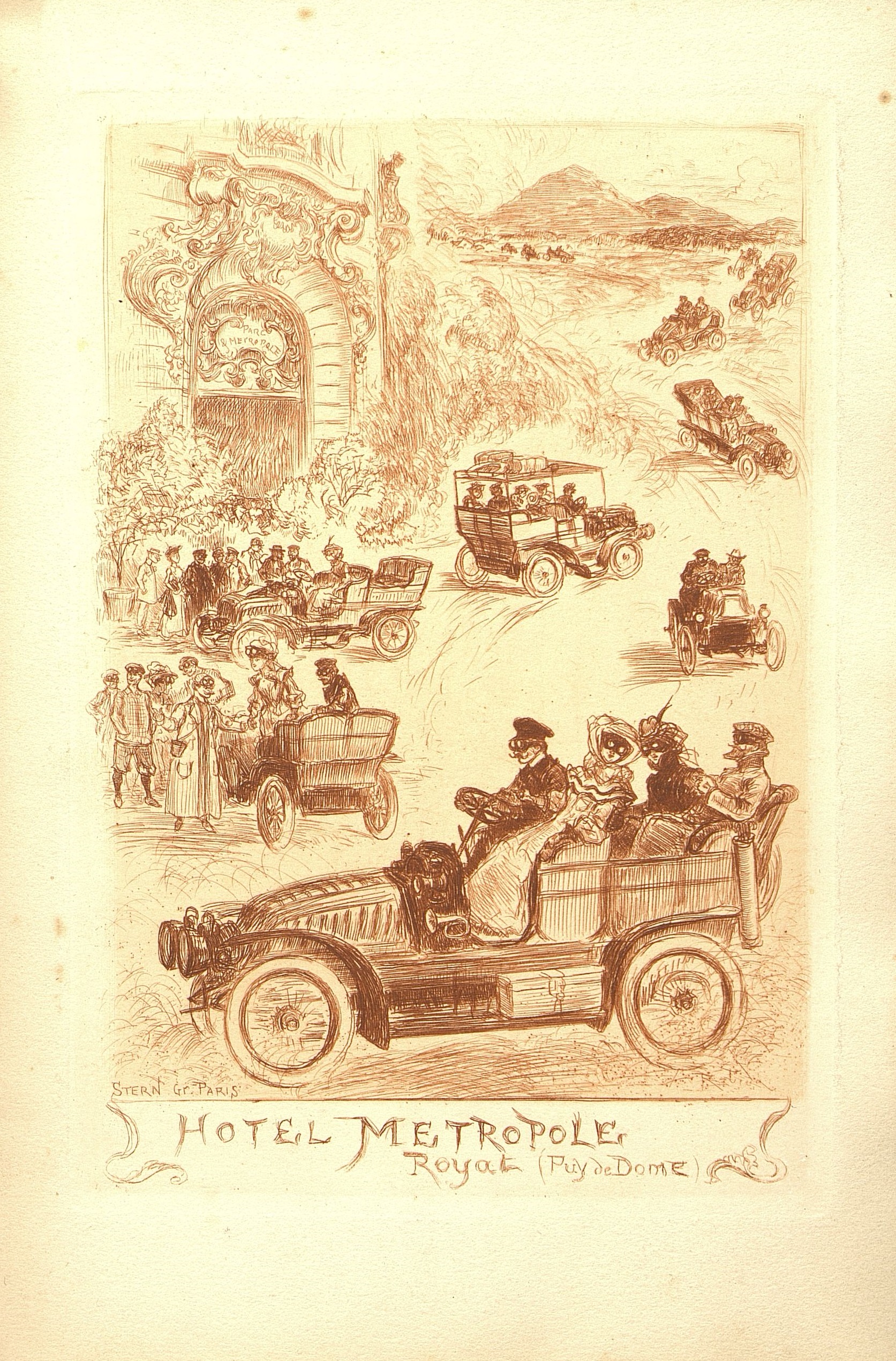 Menu dépliant et illustré de voitures pour un rallye l'Hôtel arrivée devant le Métropole à Royat (Puy-de-Dome).