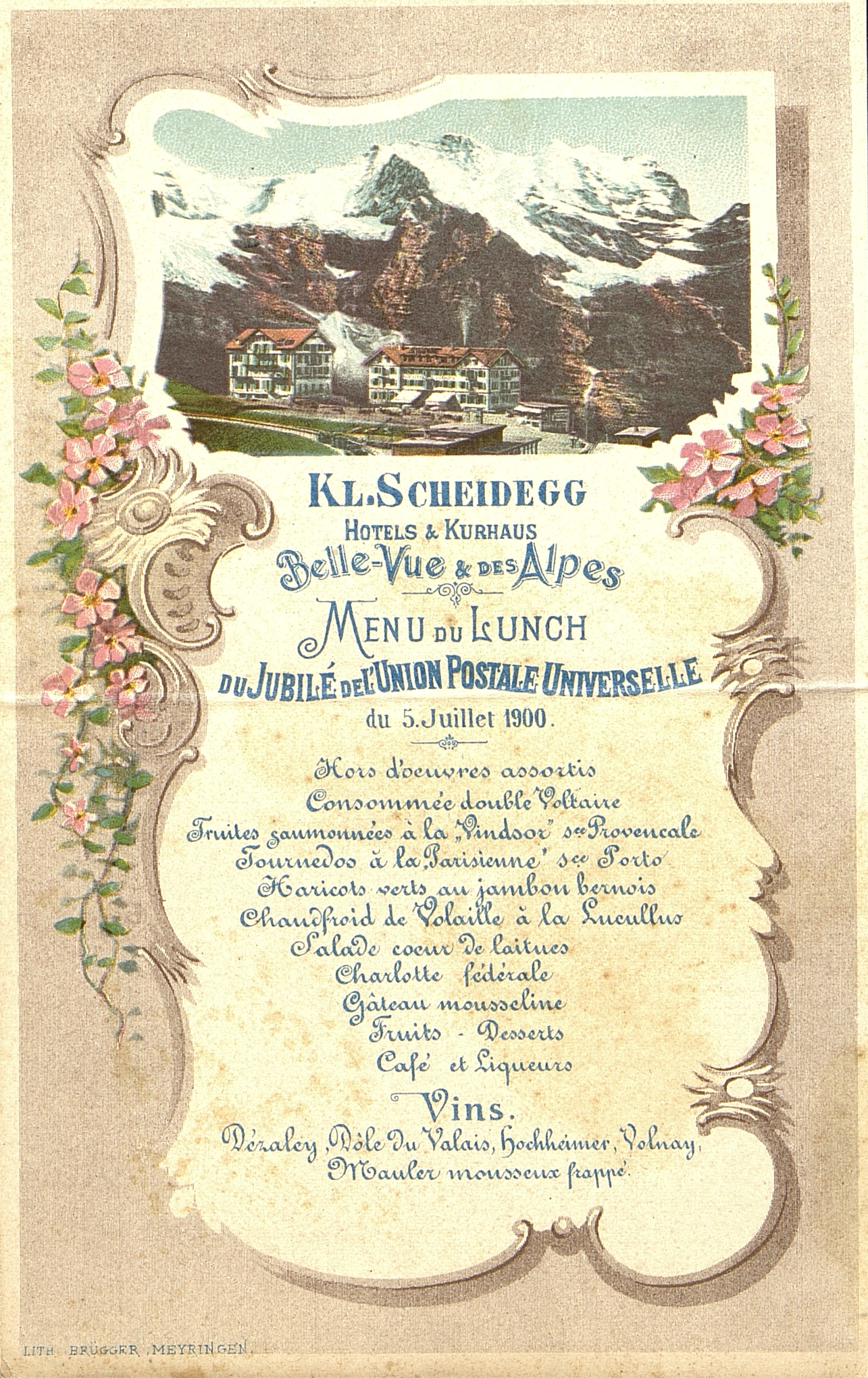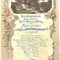 Menu illustré du Jubilé de l'Union Postale Universelle du 5 Juillet 1900. Vignette en couleur des bâtiments de l'hôtels face aux Alpes.