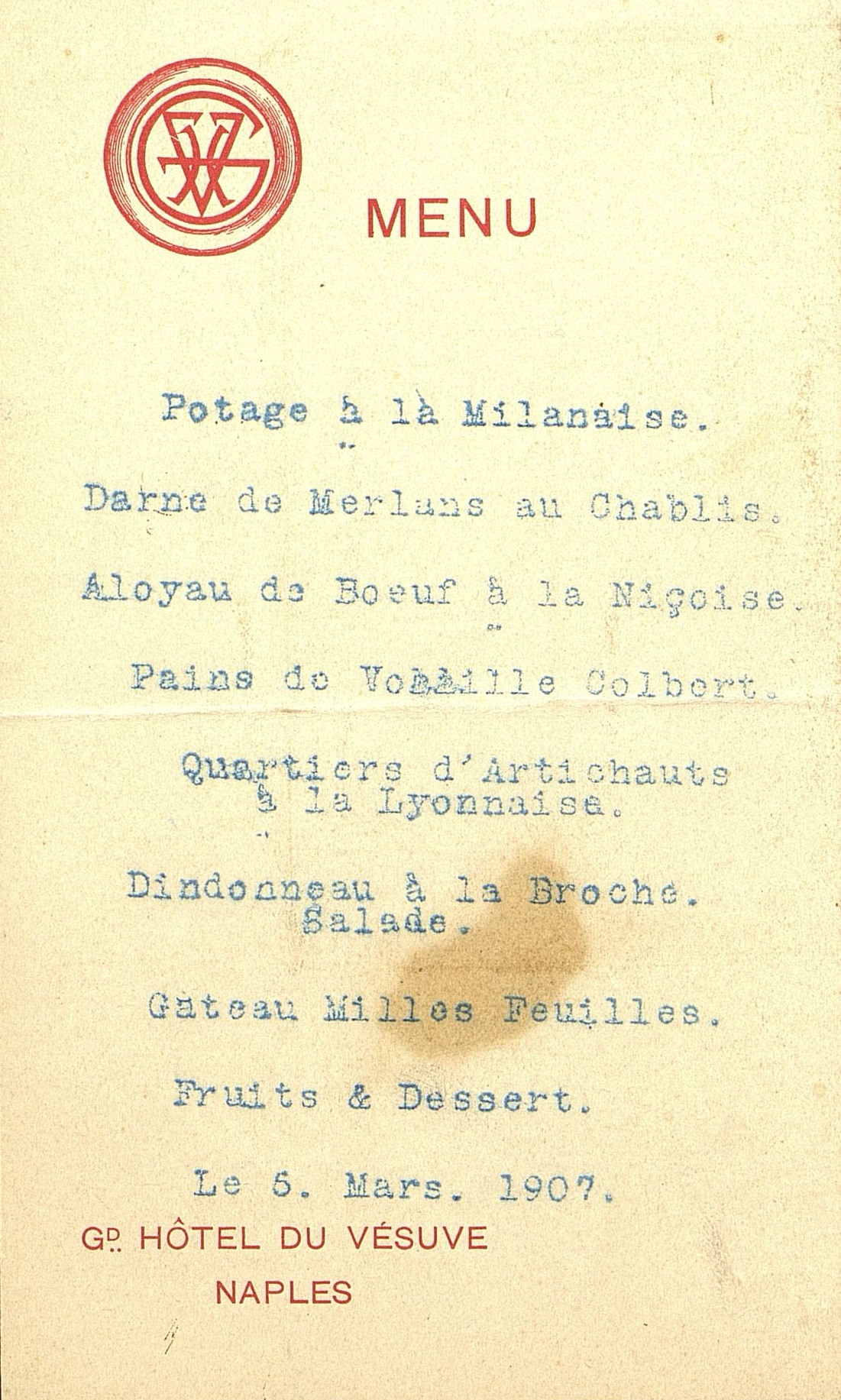 Plats servis : Potage à la Milanaise. Darne de Merlans au Chablis. Aloyau de Bœuf à la Niçoise. Pains de Volailles Colbert. Quartiers d'artichauts à la Lyonnaise. Dindonneau à la Broche. Salade.; Gâteau Mille-feuilles. Fruits et Dessert.