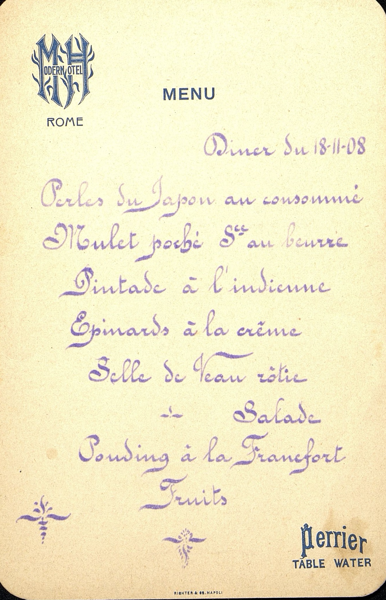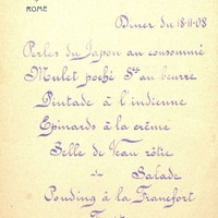 - Plats servis : Perles du Japon au consommé. Mulet poché sauce au beurre. Pintade à l'indienne. Epinards à la crème. Selle de Veau rôtie. Salade. Pouding à la Francfort. Fruits.
