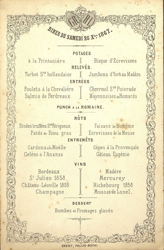 Plats servis : Potages : Potage à la Printanière. Bisque d'Ecrevisses. Relevés : Turbot sauce Hollandaise. Jambons d'York au Madère. Entrées : Poulets à la Chevalière. Salmis de Perdreaux. Chevreuil sauce Poivrade. Mayonnaises de Homards. Punch à la Romaine. Rôts : Dinde truffées sauce Périgueux. Pâtés de Foies gras. Faisans de Bohême. Ecrevisses de la Meuse. Entremets : Cardons à la Moëlle. Gelées à l'Ananas. Cèpes à la Provençale. Gâteau Eugénie. Dessert : Bombes et Fromages glacés.