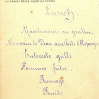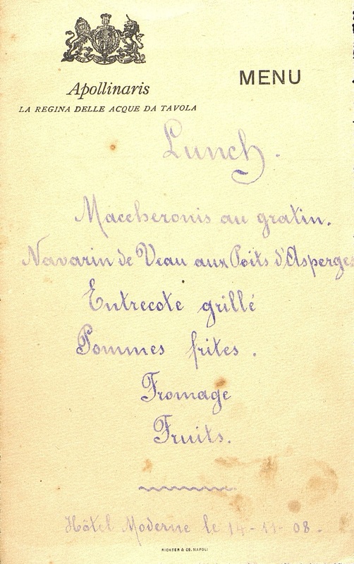 Plats servis : Macaronis au gratin. Navarin de Veau aux pointes d'asperges. Entrecôte grillée. Pommes frites. Fromage. Fruits.