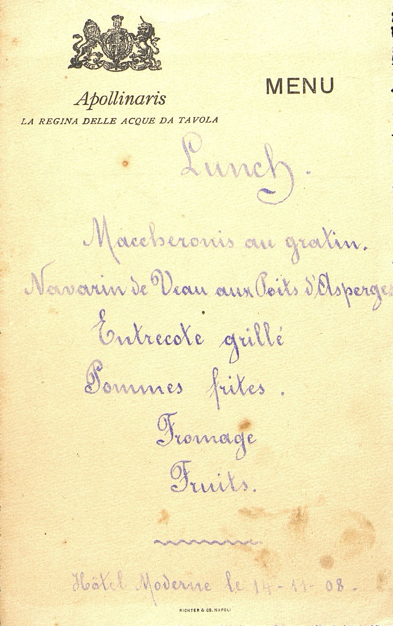 Menu publicitaire pour l'eau de table Apollinaris de l'Hôtel Moderne à Naples.