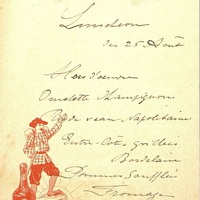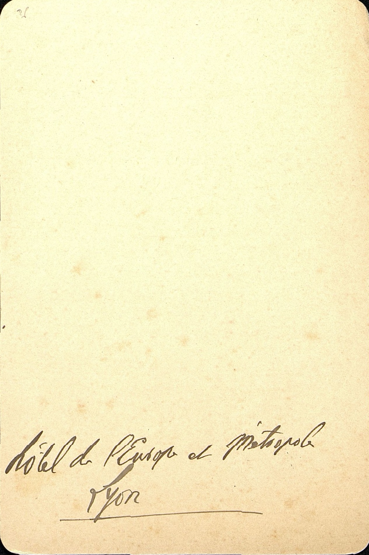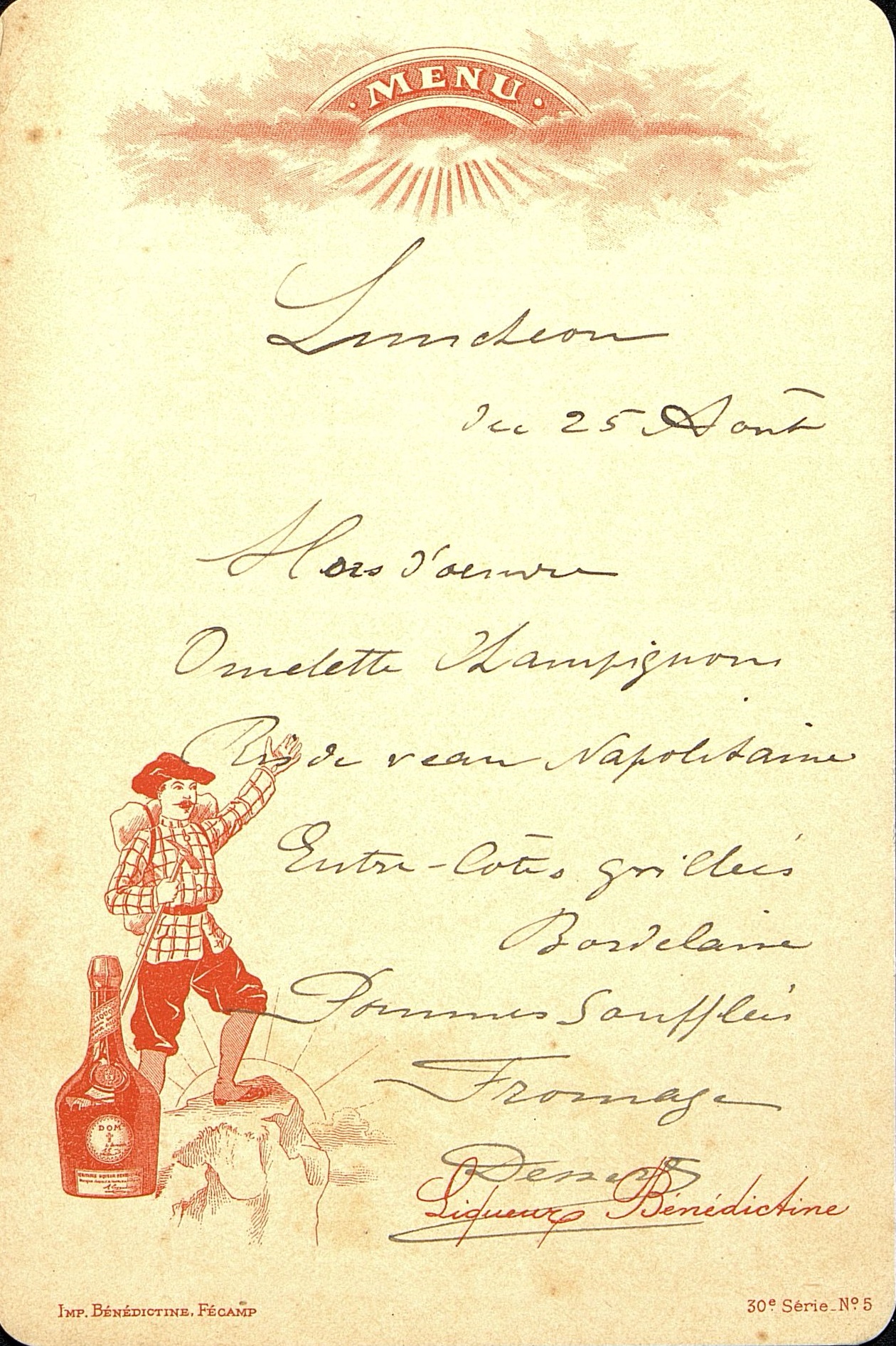 Menu illustré du 25 août à l'Hôtel de l'Europe et Métropole à Lyon. Publicité pour la Liqueur Bénédictine. Au dos mentions manuscrites. 30e Série -N° 5. Illustration : un alpiniste au sommet devant le soleil et une bouteille de Bénédictine.