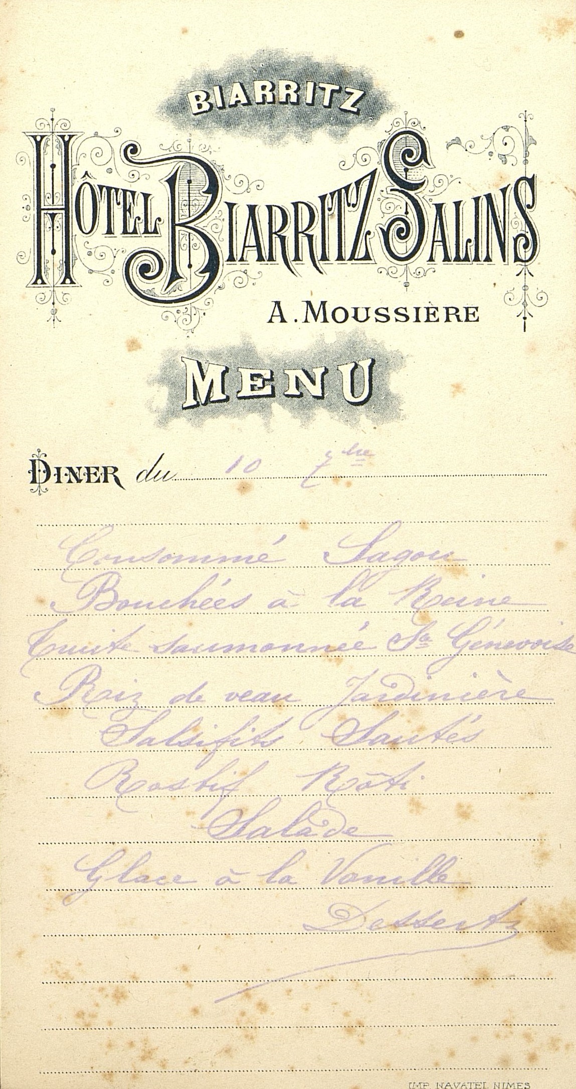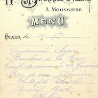 Plats servis : Consommé Sagou. Bouchées à la Reine. Truite saumonée sauce Genevoise. Riz de veau Jardinière. Salsifis sautés. Rosbif Rôti. Salade ; Glace à la Vanille. Desserts.