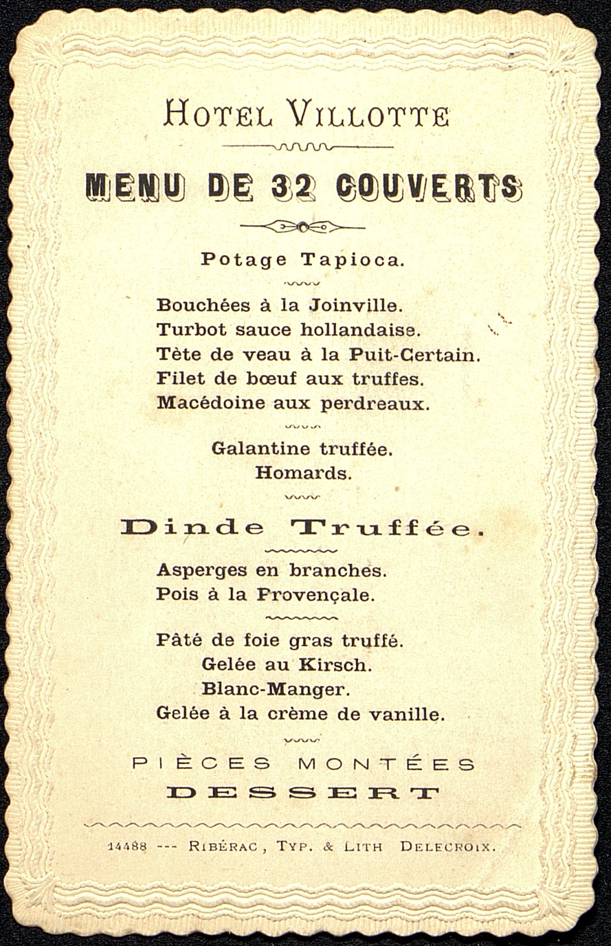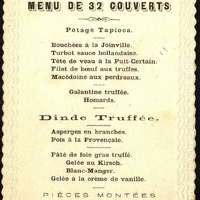 Plats servis : Potage tapioca. Bouchées à la Joinville. Turbot sauce hollandaise. Tête de veau à la Puit-Certain. Filet de bœuf aux truffes. Macédoine aux perdreaux. Galantine truffée. Homards. Dinde truffée. Asperges en branches. Pois à la Provençale. Pâté de foie gras truffé. Gelée au Kirsch. Blanc-manger. Gelée à la crème de vanille. Pièces montées. Dessert.