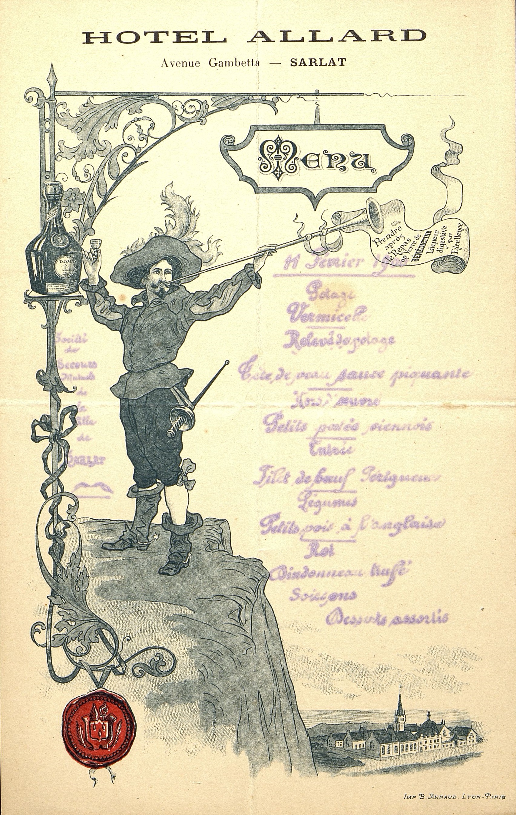 Menu de l'Hôtel Allard à Sarlat pour la Société de Secours Mutuels de la Ville de Sarlat