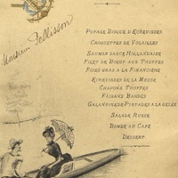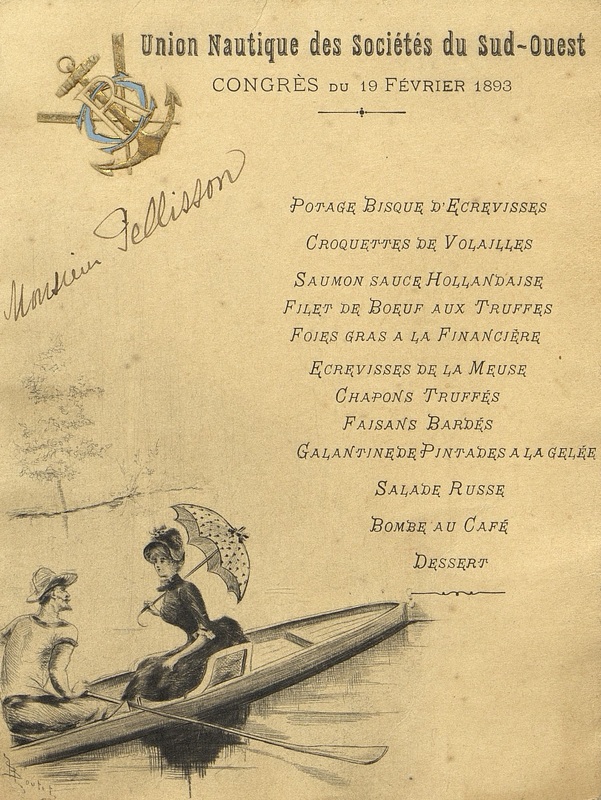 Menu avec note manuscrite : Monsieur Pellisson. Emblème de la Société en coin droit : Deux rames dorées croisées avec une ancre de marine dorée enrichie de deux lettres "C" bleues entrecroisées surmontées d'une lettre "R" blanc. Illustration : un couple dans une barque.