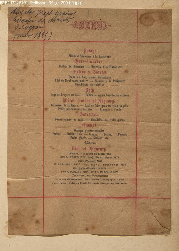 Boissons : Café. Vins et liqueurs : Madère (Lafaurie du chatel 1852). Château Gravelines (sec) 1874 et (doux) 1875. Saint-Christoly 1880. Milon-Duhart 1878. Château Poujeau 1874. Bourgogne Chambertin 1872 ; Château Poujeau 1869. Château Margaux 1870. Champagne Roeder. Grande Champagne 1811. Petite Champagne 1852. Chartreuse. Anisette Marie-Brizard. Curaçao de Hollande.