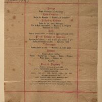 Plats servis : Potage : Bisque d’Écrevisses à la Parisienne. Hors d’œuvres : Huîtres de Marennes. Bouchées à la Financière. Relevé et Entrées : Truite du Lac, sauce Hollandaise. Filet de Bœuf sauce Madère. Bécasses à la Périgueux. Chaud-froid de volailles. Rots : Coqs de bruyère truffés. Cailles de vignes bardées au cresson. Pièces froides et légumes : Écrevisses de la Meuse. Pâtés de foies gras truffés à la gelées. Petits pois nouveaux au sucre. Asperges à l'huile. Entremets : Bombe glacée au café. Macédoine de fruits glacés. Dessert : Oranges glacées montées. Fraises. Raisins frais. Ananas. Poires. Pommes. Fruits glacés. Gâteaux, etc.