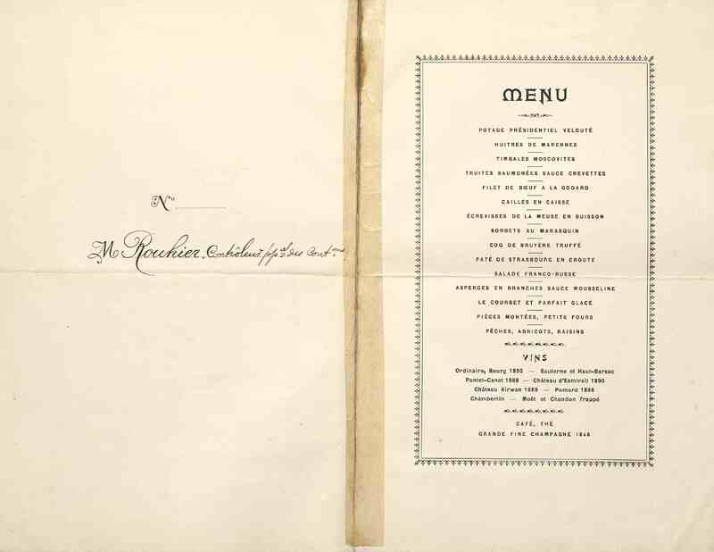 Boissons : Vins : Ordinaire. Bourg 1893. Sauterne et haut-Barsac. Pontet-Canet 1888. Château d'Esmirail 1890. Château Kirwan 1889. Pomard 1886. Chambertin. Moët et Chandon frappé. Café. Thé. Grande Fine Champagne 1848.