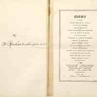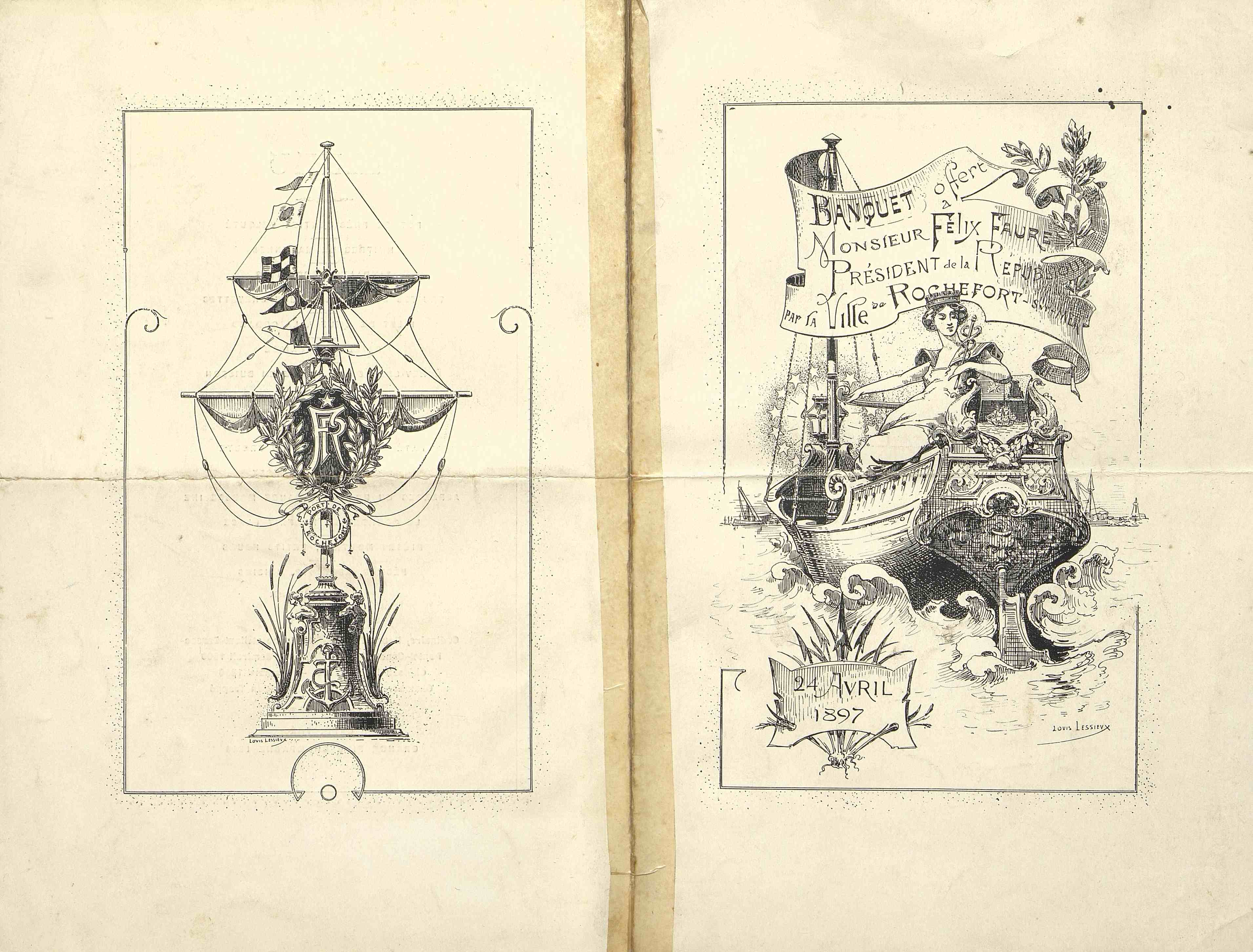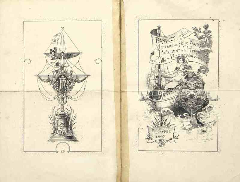 Banquet offert à M. Félix Faure, président de la République par la Ville de Rochefort. Menu illustré et réparé au nom de M. Rouhier. Illustration : un mat trophée de la Ville de Rochefort et navire allégorie aux armes du Port de Rochefort par Louis Lessieux.