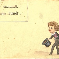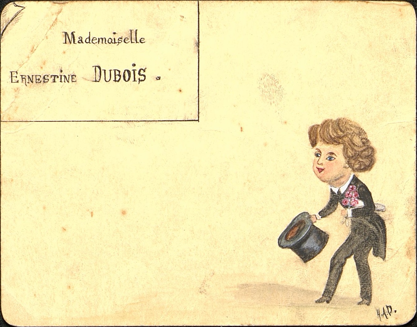 - Menu au nom de Mademoiselle Ernestine Dubois. Illustration d'un dessin d'un prétendant en redingote et chapeau haut de forme avec un bouquet de fleurs roses faisant révérence. signé H.A.P.