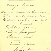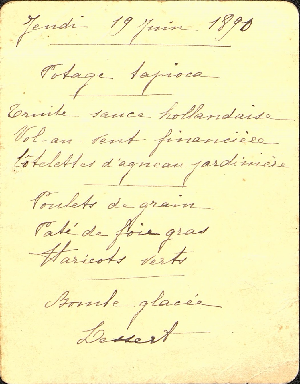 - Plats servis : Potage tapioca. Truite sauce hollandaise. Vol-au-vent financière. Côtelettes d'agneau jardinière. Poulets de grain. Pâté de foie gras. Haricots verts. Bombe glacée. Dessert.