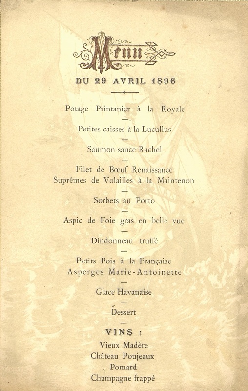 Menu : Potage printanier à la Royale. Petites caisses à la Lucullus. Saumon sauce Rachel. Filet de bœuf Renaissance. Suprême de Volailles à la Maintenon. Sorbets au Porto. Aspic de Foie gras en belle vue. Dindonneau truffé . Petits Pois à la Française. Asperges Marie-Antoinette . Glace Havanaise. Dessert