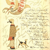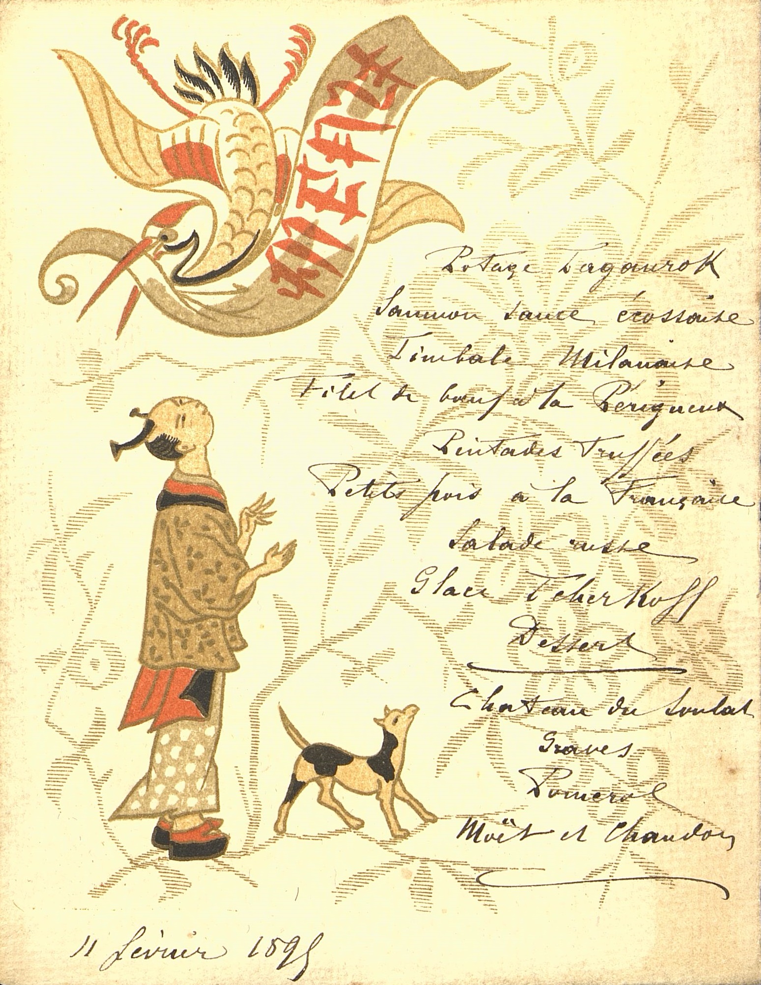 Menu décoré d'inspiration asiatique : une grue tient un message en son bec au-dessus d'un homme en habits traditionnels avec un chien noir et blanc.