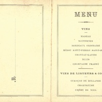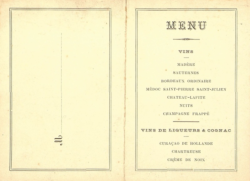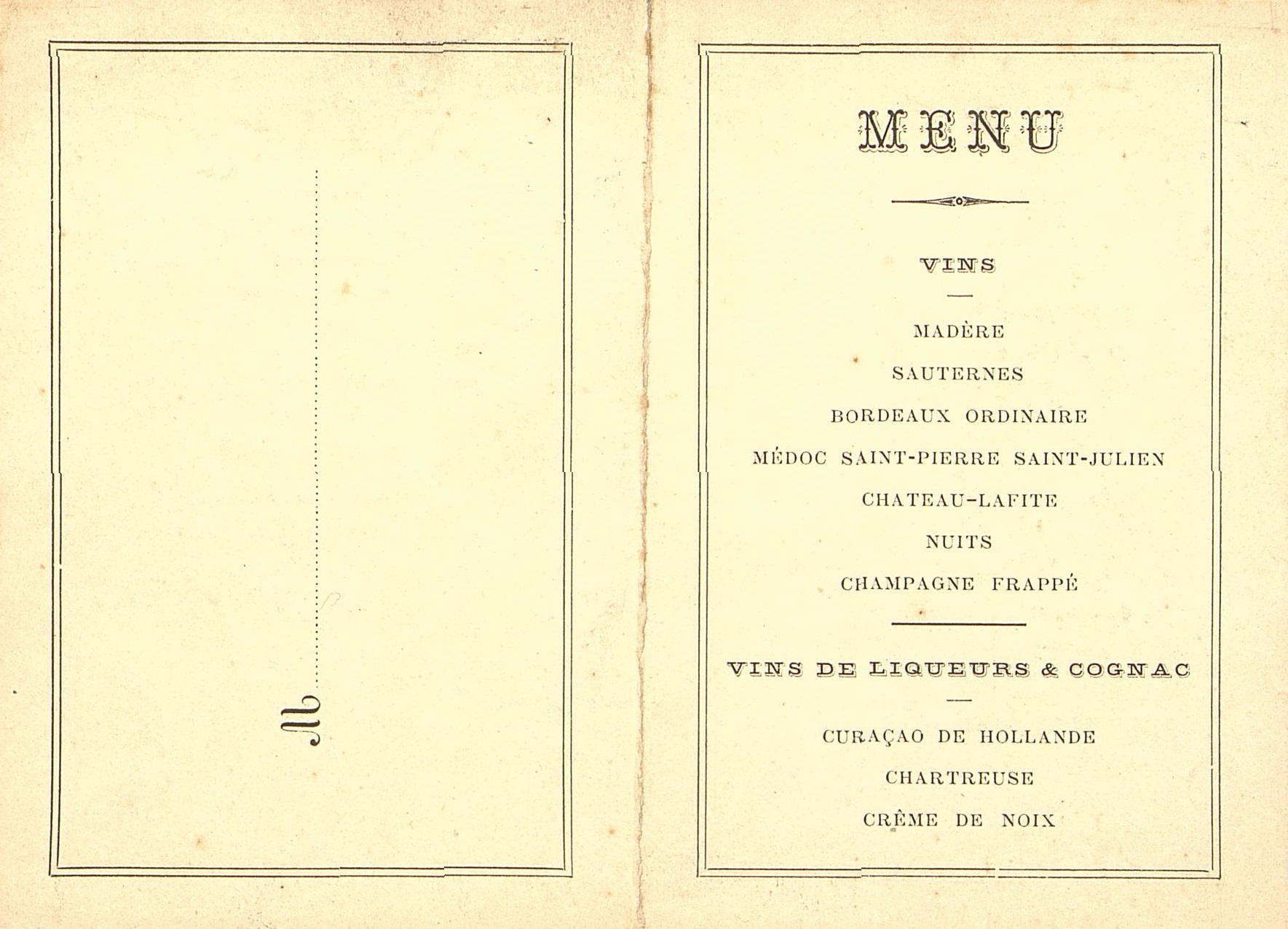Boissons : Vins : Madère. Sauternes. Bordeaux Ordinaire. Médoc Saint-Pierre Saint-Julien. Château-Lafite. Nuits. Champagne frappé. Vins de Liqueurs et Cognac. Curaçao de Hollande. Chartreuse. Crème de Noix. Thé et Café.