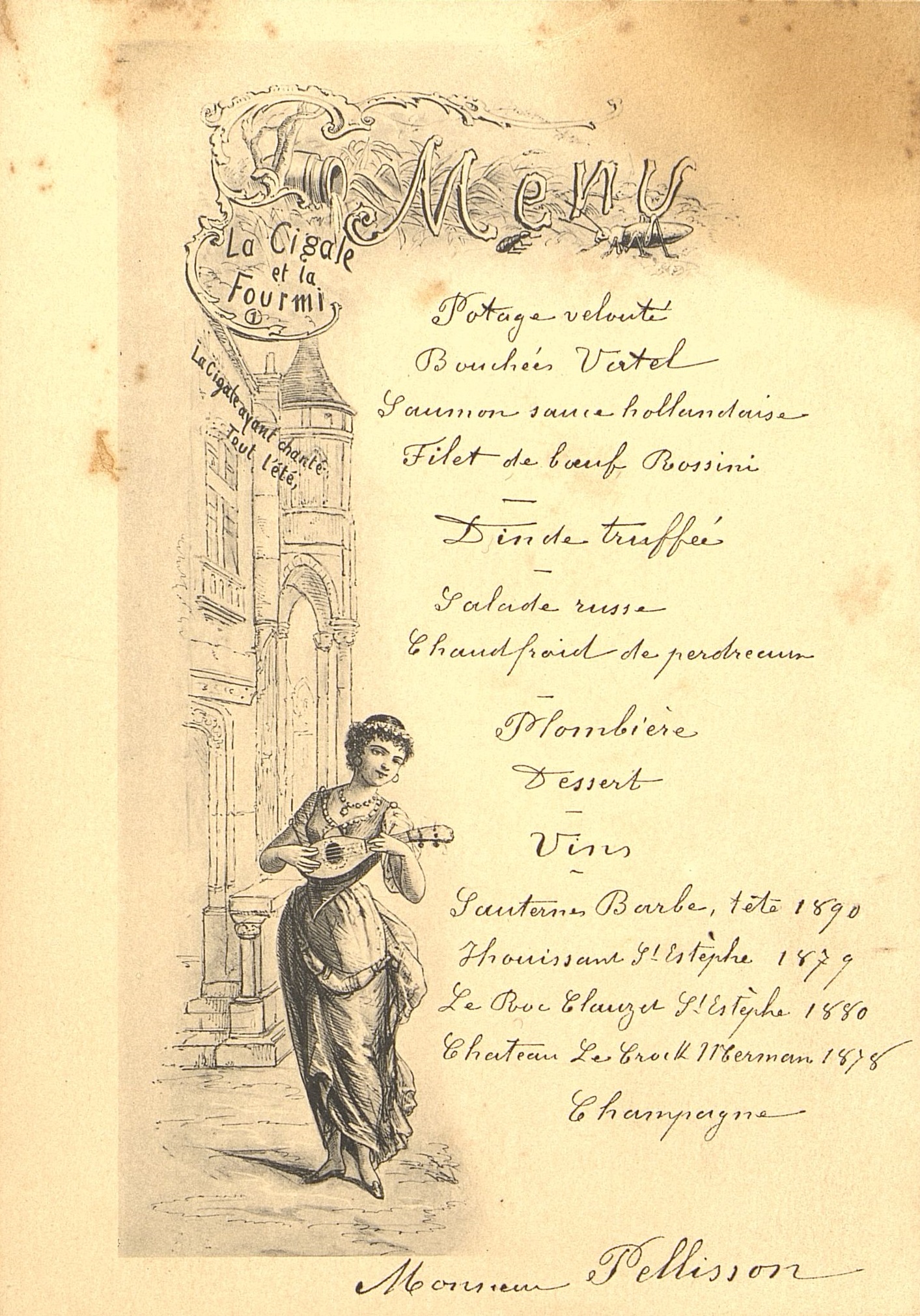 Menu adressé à Monsieur Pellisson porté en manuscrit. Illustré, avec une strophe du poème de La Fontaine.