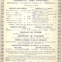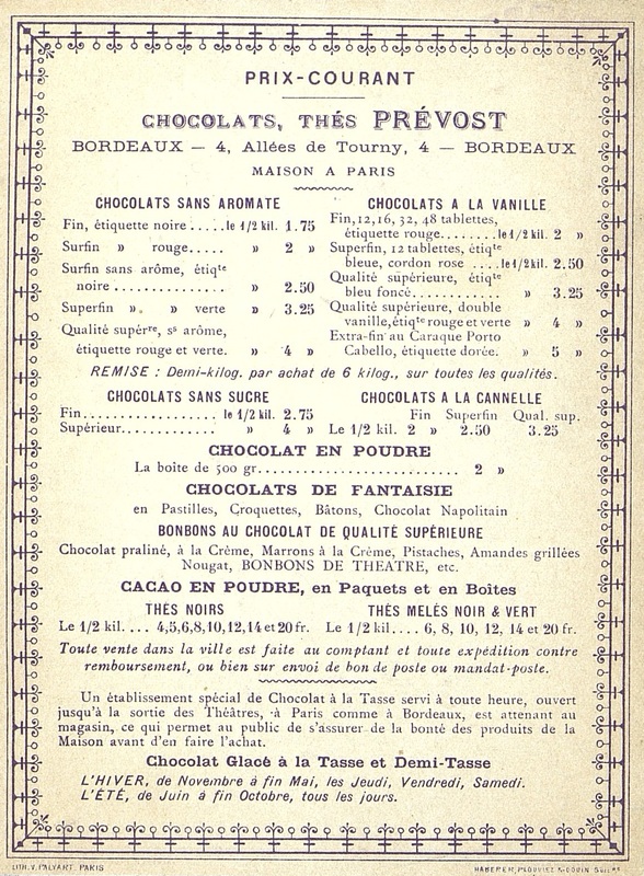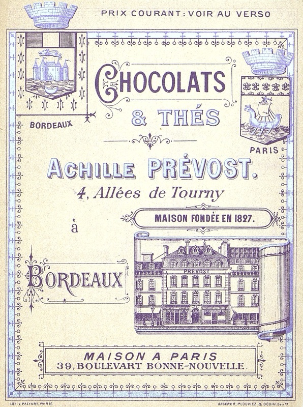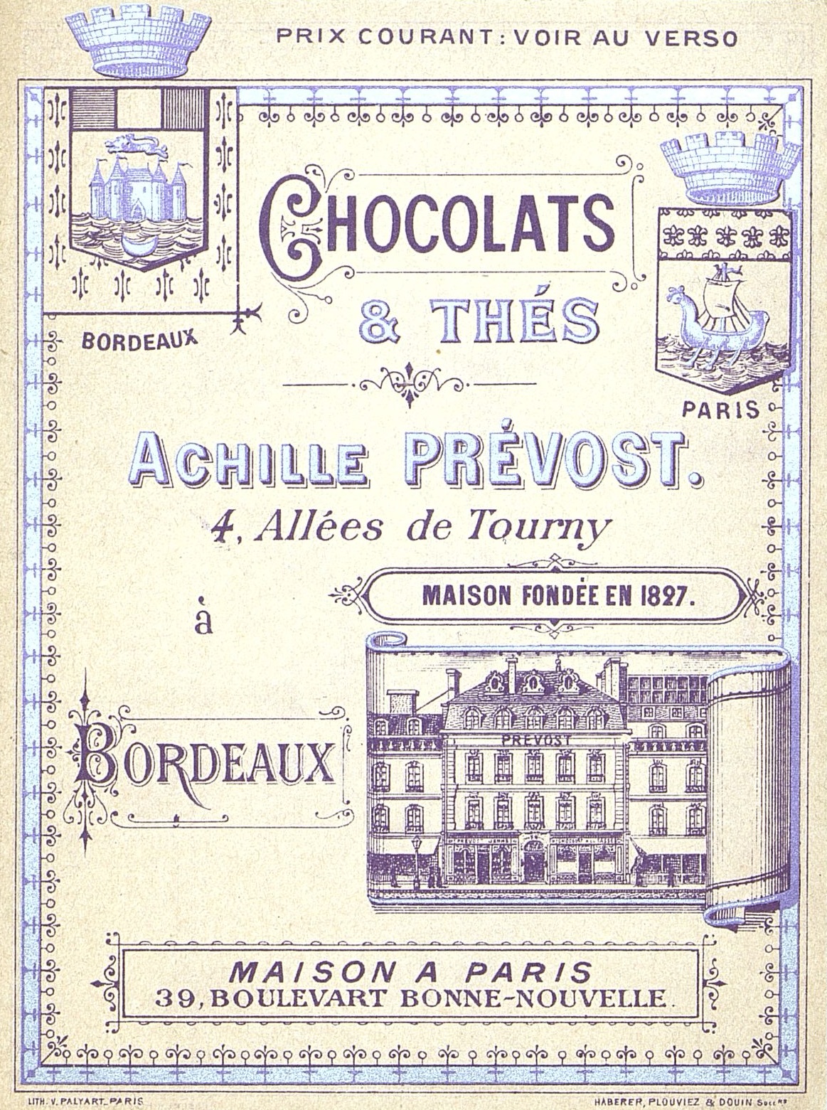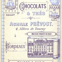 Carte publicitaire des produits de la Maison Achille Prévost à Bordeaux. Tarifs sur le verso de cette carte. Vignette du magasin. Adresse à Paris 39 Boulevard Bonne-nouvelle.