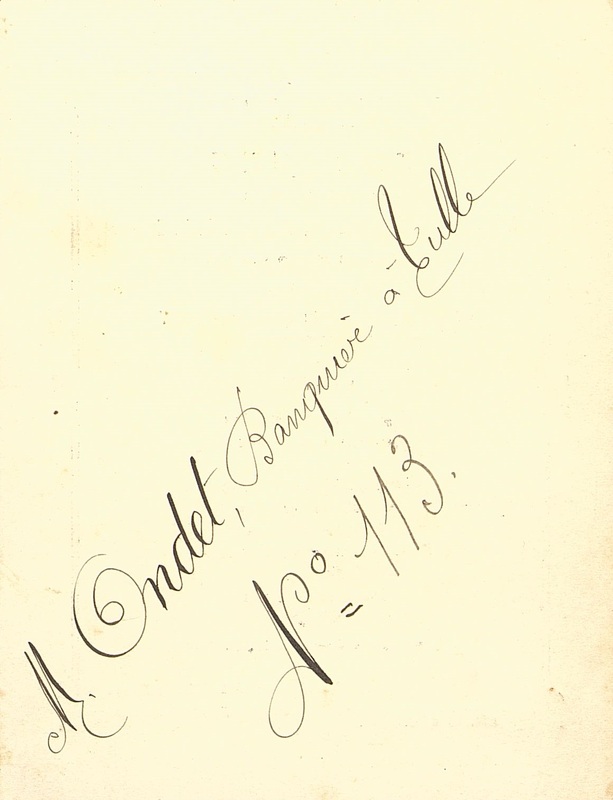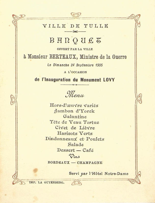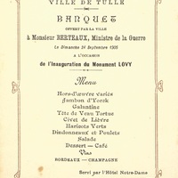 Menu de la Ville de Tulle pour l'inauguration du monument Lovy. Au verso note manuscrite du menu : M. Ondet, banquier à Tulle, N°113.