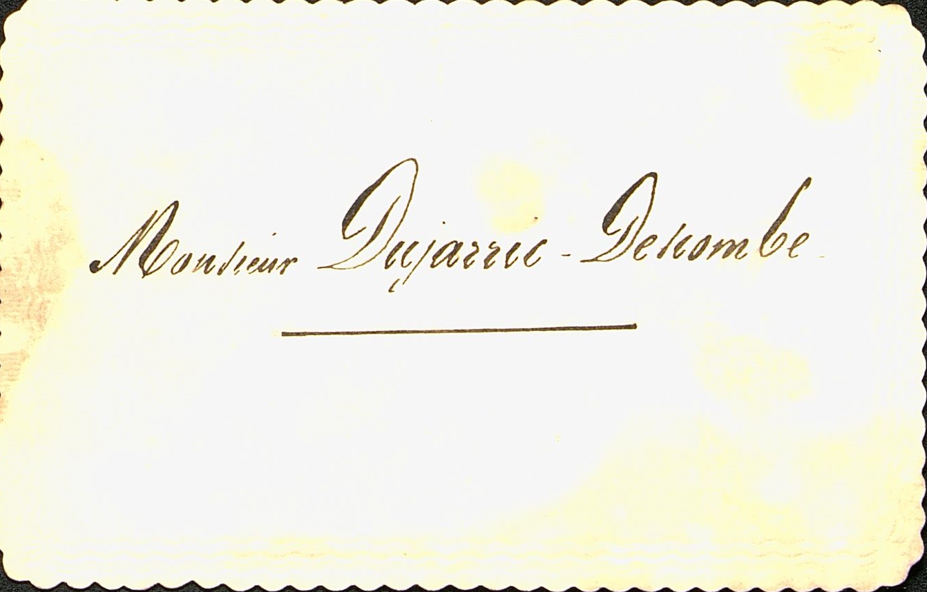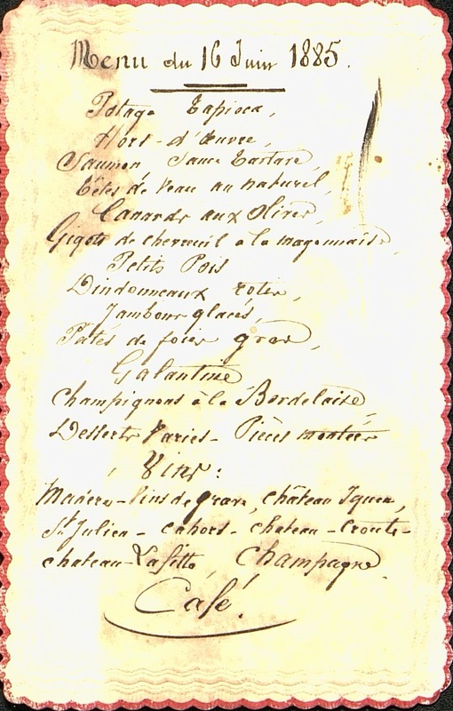 Menu manuscrit du 16 juin 1885 au nom de Dujarric-Descombe. Pas d'indication de lieu.