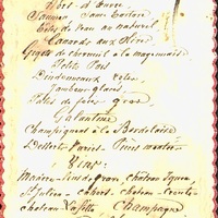 Potage Tapioca ; Hors d’œuvre ; Saumon sauce Tartare ; T^tes de Veau au Naturel ; Canards aux Olives ; Gigots de Chevreuil à la Mayonnaise ; Petits pois ; Dindonneaux rôtis ; Jambons glacés ; Pâtés de Foies gras ; Galantine ; champignons à la Bordelaise ; Desserts variés, Pièces montées.