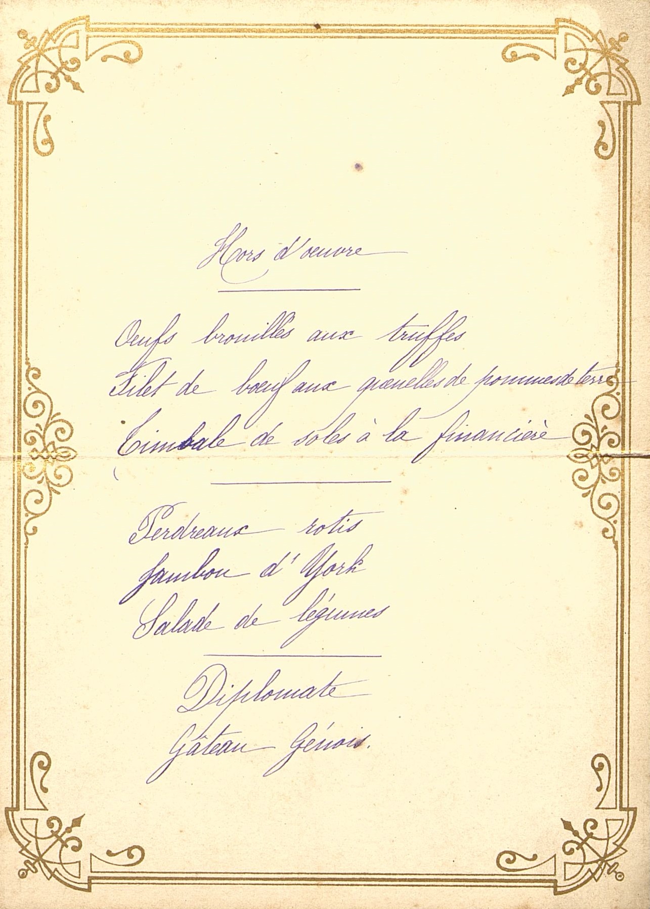 Oeufs brouillés aux truffes ; Filet de bœuf aux quenelles de pommes de terre ; Timbale de soles à la financière ; Perdreaux rôtis ; Jambon d'York ; Salade de légumes ; Diplomate ; Gâteau Génois. - Identifiant