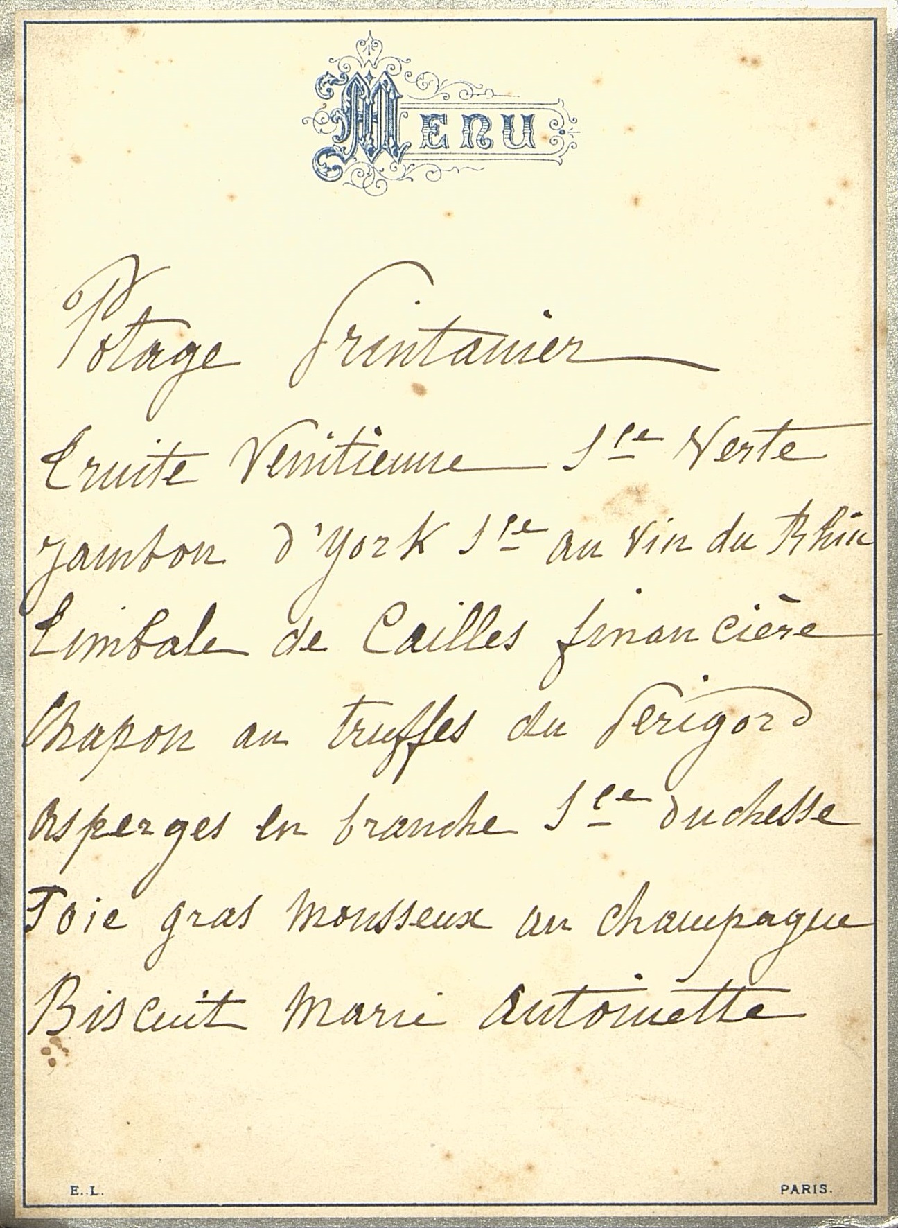 Potage Printanier ; Truite Vénitienne sauce Verte ; Jambon d'York sauce au vin du Rhin ; Timbale de Cailles financière ; Chapon aux Truffes du Périgord ; Asperges en branche sauce duchesse ; Foie gras mousseux au Champagne ; Biscuit Marie Antoinette. - Identifiant