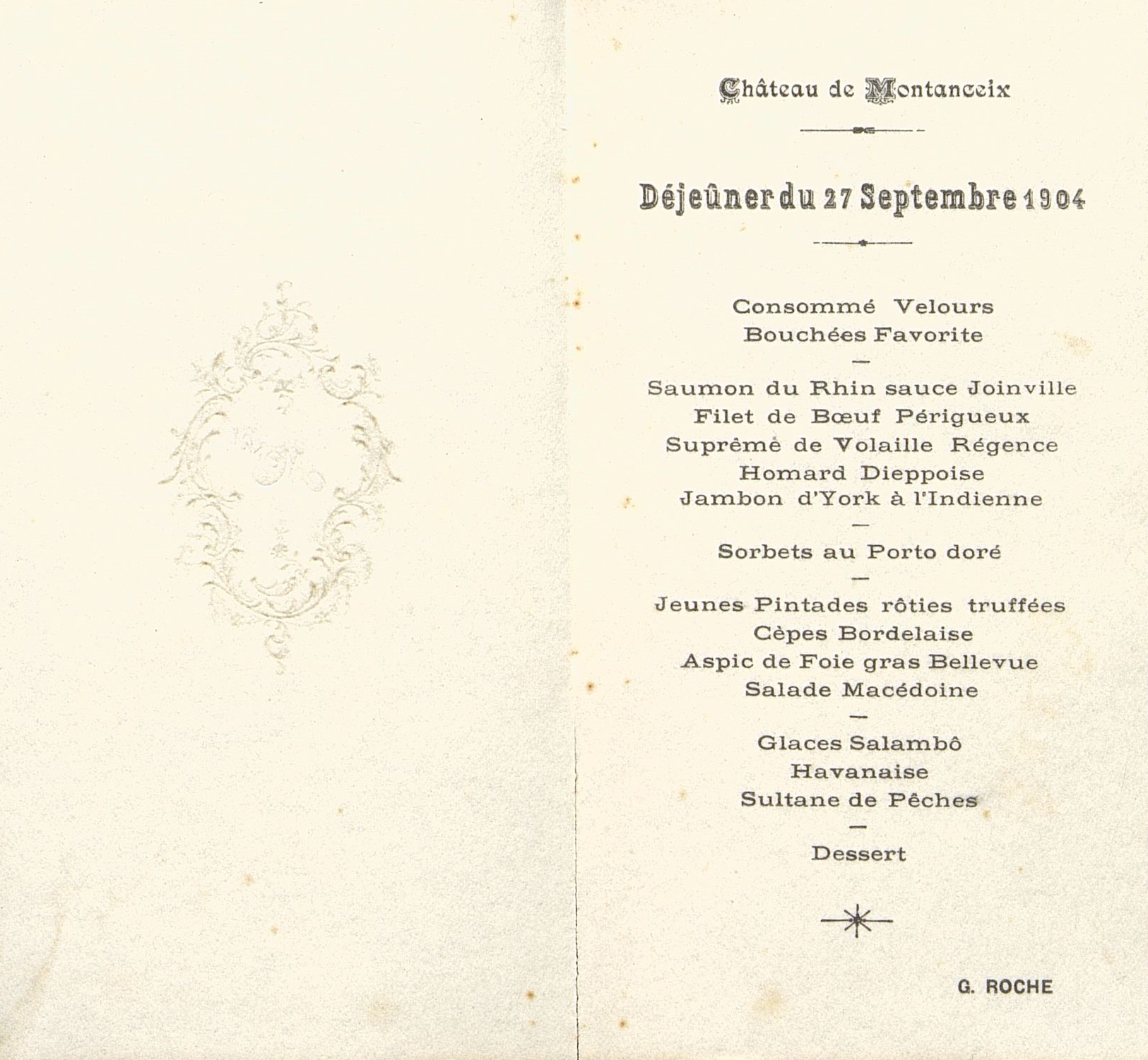 Consommé Velours. Bouchées Favorite. Saumon du Rhin sauce Joinville. Filet de Bœuf Périgueux. Suprême de Volaille Régence. Homard Dieppoise. Jambon d'York à l'Indienne. Sorbet au Porto doré. Jeunes Pintades rôties truffées. Cèpes Bordelaise. Aspic de Foie gras Bellevue. Salade Macédoine. Glace Salambô. Havanaise. Sultane de Pêches. Dessert.