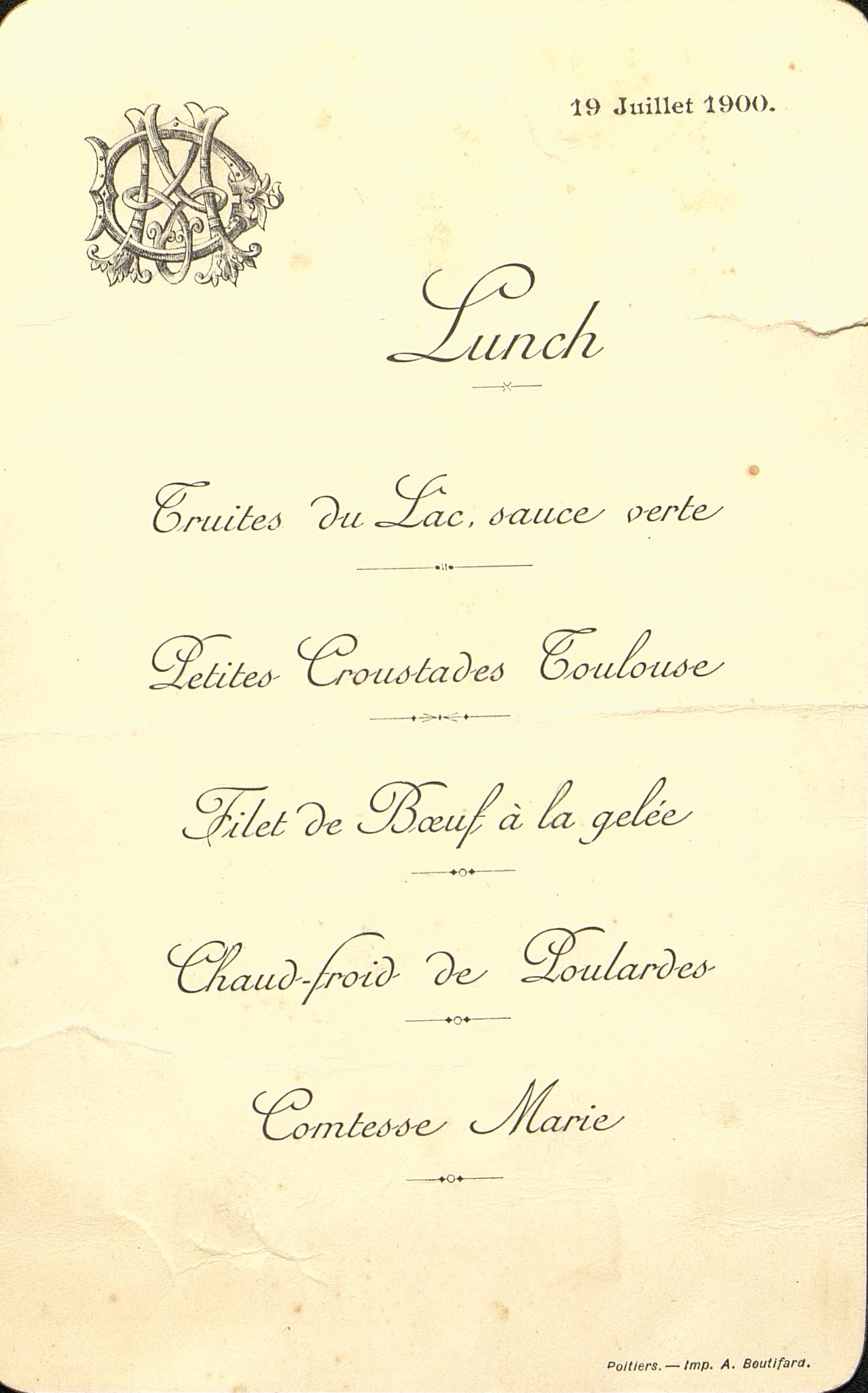 Lunch du 19 juillet 1900. Monogramme MD. Pas d'indication de lieu.