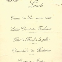 Truite du Lac sauce Verte ; Petites Croustades Toulouse ; Filet de Bœuf à la Gelée ; Chaud-froid de Poulardes ; Comtesse Marie.