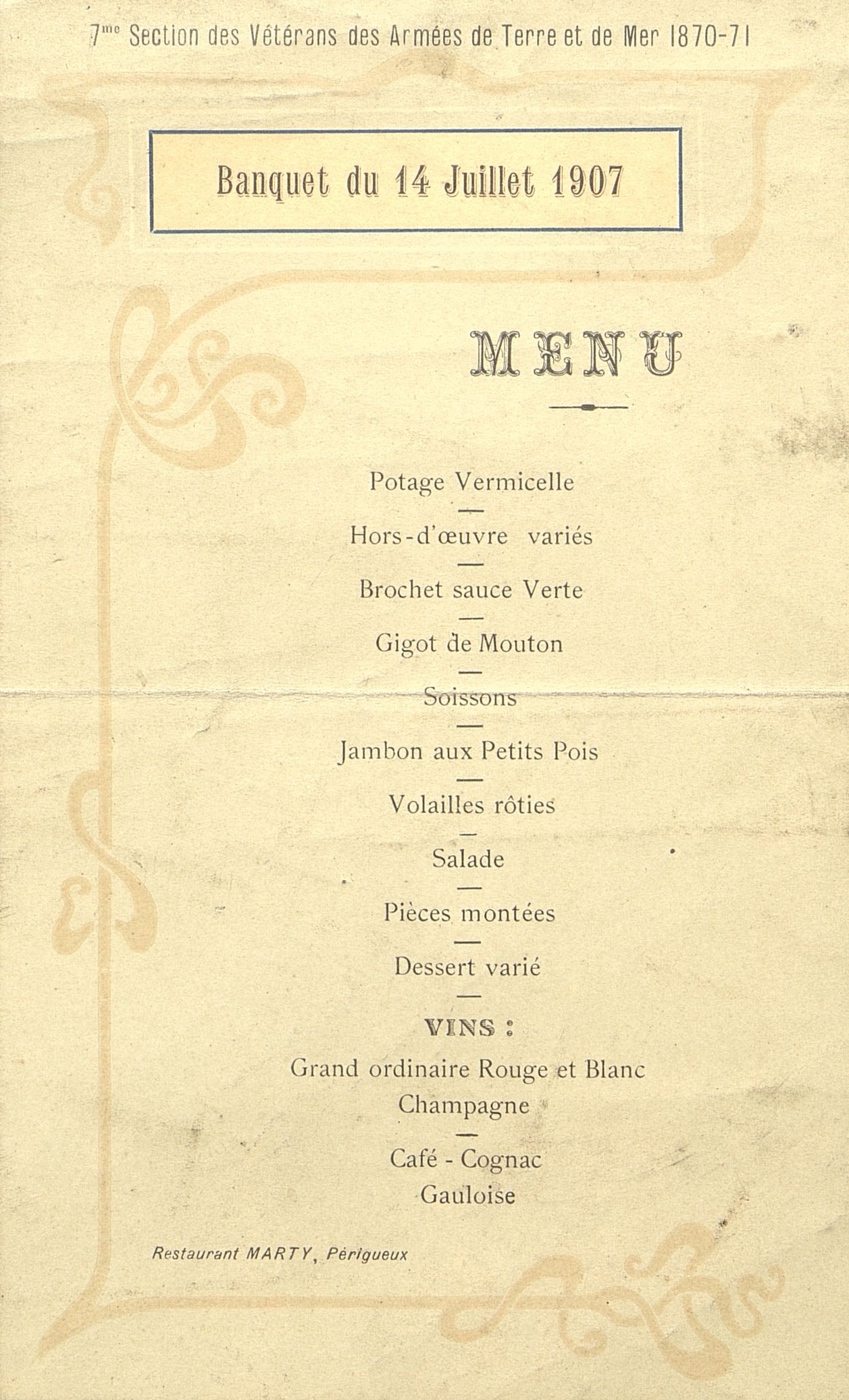 Banquet du 14 juillet 1907 au Restaurant Marty à Périgueux.