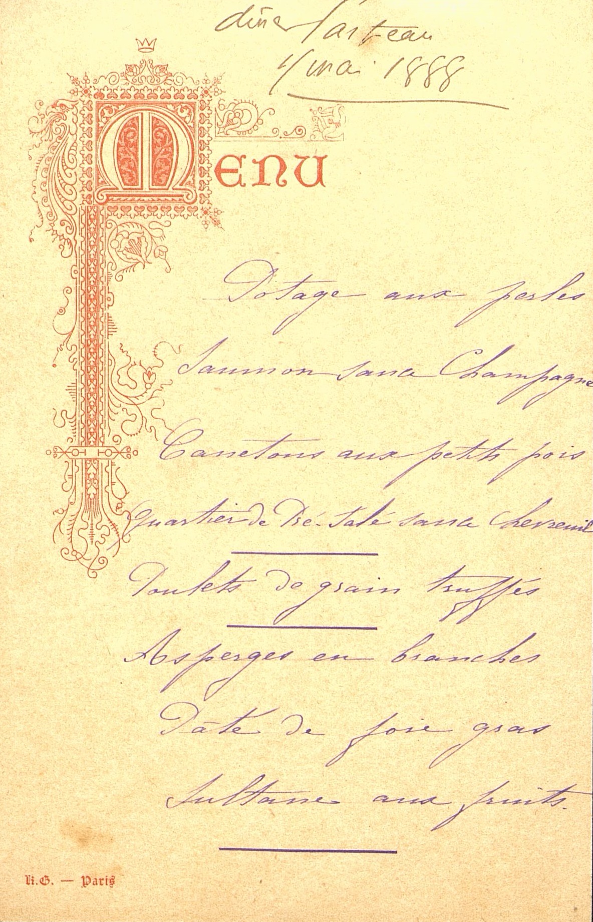 Potage aux perles ; Saumon sauce Champagne ; Canetons aux petits pois ; Quartier de pré-salé sauce chevreuil ; Poulets de grain truffés ; Asperges en branches ; Pâté de foie gras ; Sultane aux fruits.