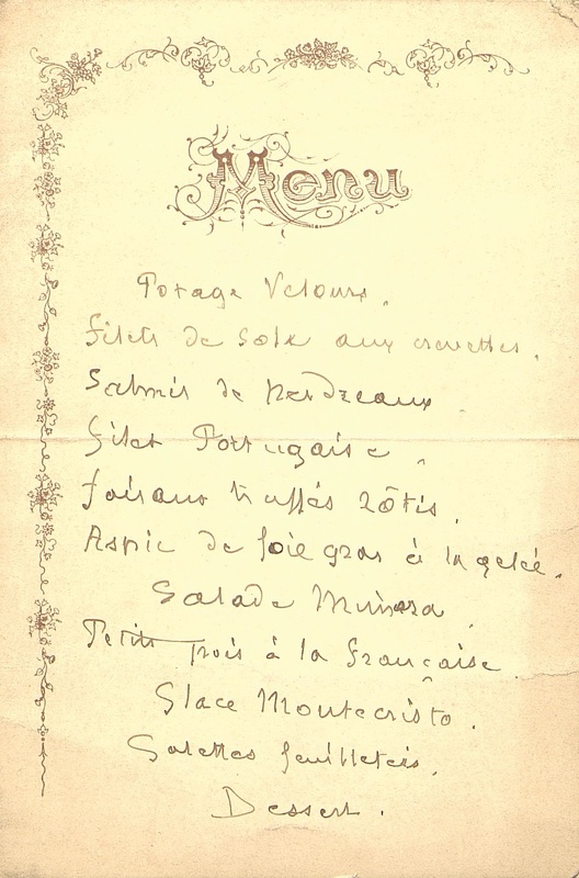 Plats servis : Potage Velours. Filets de Sole aux crevettes. Salmis de Perdreaux. Filet Portugaise. Faisans truffés rôtis. Aspic de foie gras à la Gelée. Salade Mimosa. Petits pois à la Française. Glace Montecristo. Galettes feuilletées. Dessert.