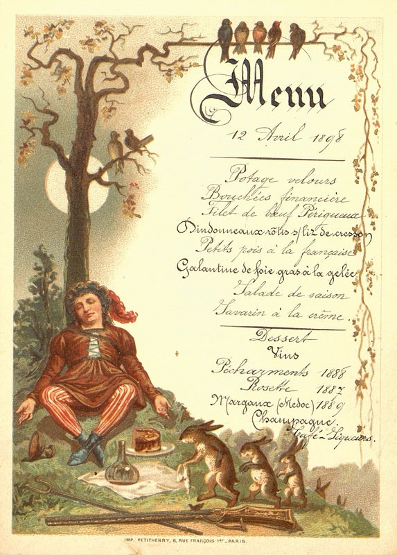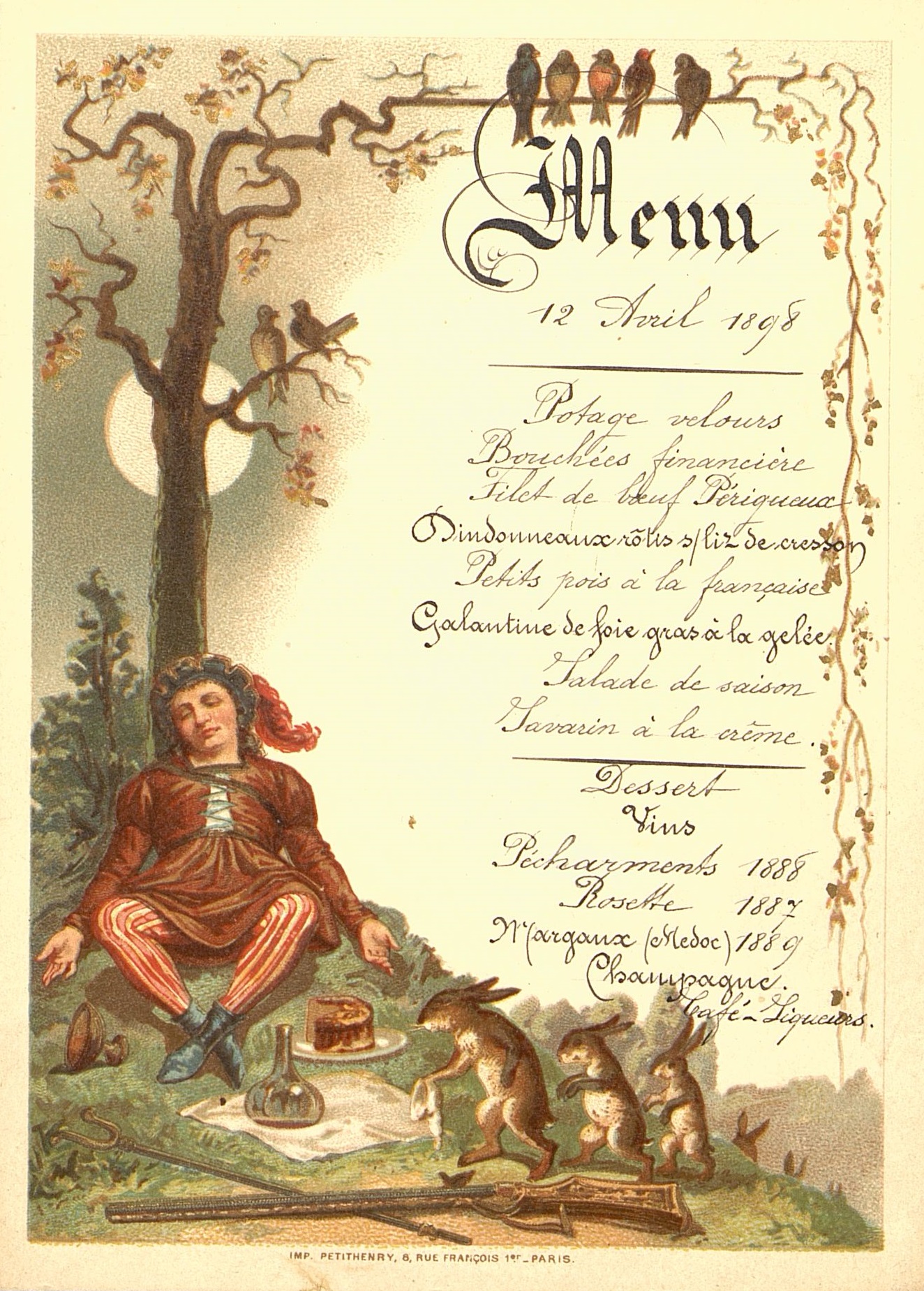 Boissons : Vins : Pécharmand 1888 ; Rosette 1887, Margaux (Médoc) 1889, Champagne, Café et Liqueurs.