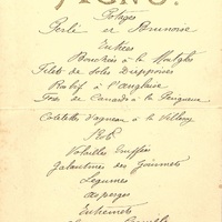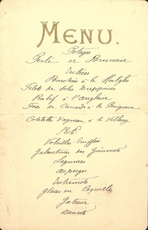 Plats servis : Potages Perlé et Brunoise. Entrées : Bouchées à la Monglas. Filets de Soles Dieppoises. Rosbif à l'Anglaise. Foies de Canards à la Périgueux. Côtelettes d'agneau à la Villeroy. Rôt : Volailles truffées. Galantine des Gourmets. Légumes : Asperges. Entremets : Glaces en Coquilles. Gâteaux. Desserts.