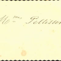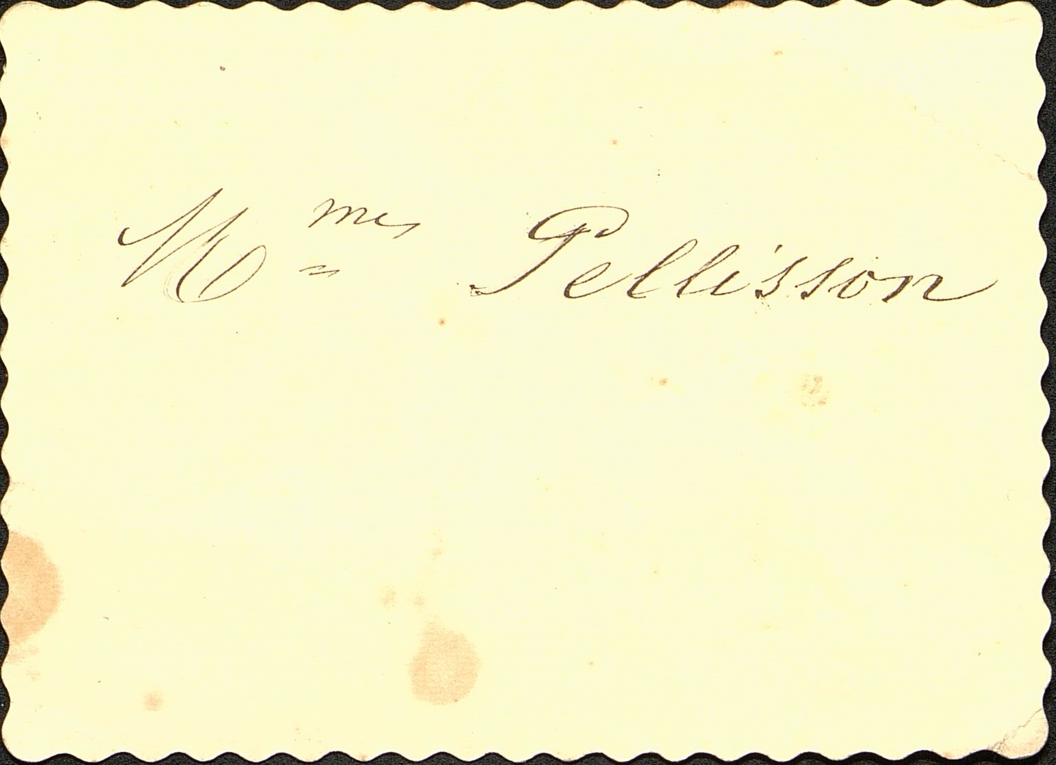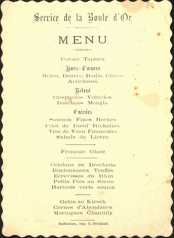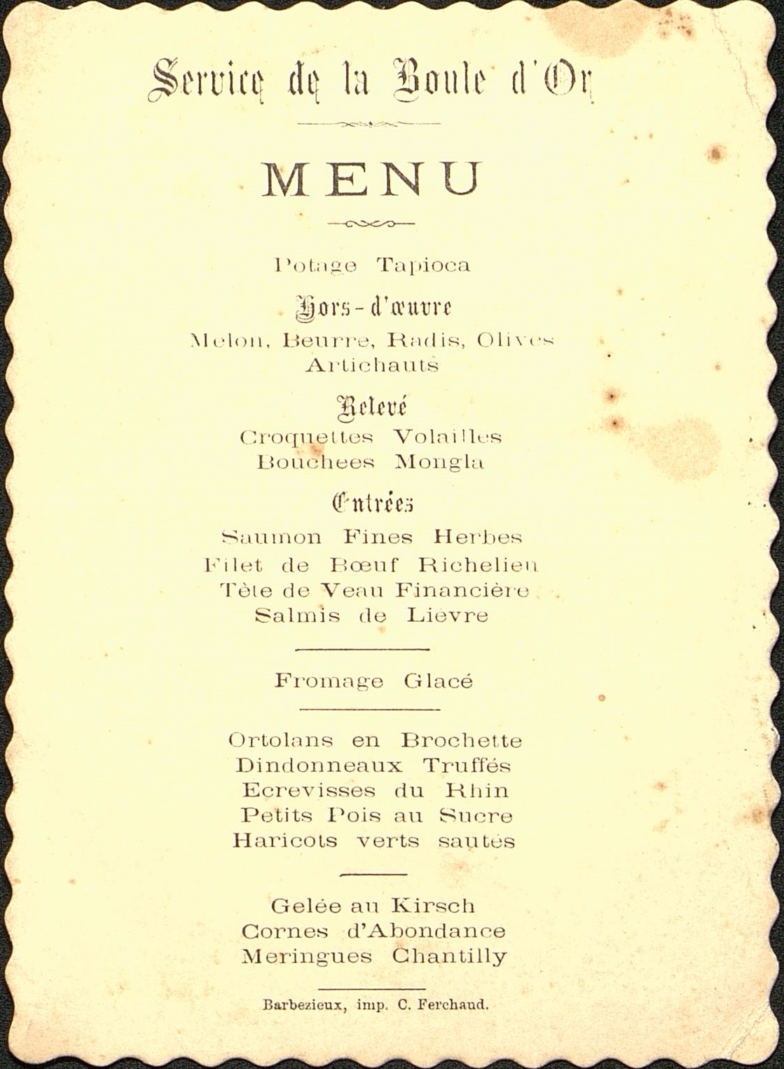Carte aux rebords ondés. Menu du Service de la Boule d'Or. Au verso en note manuscrite : Mme Pellisson.