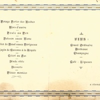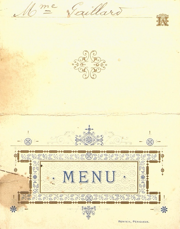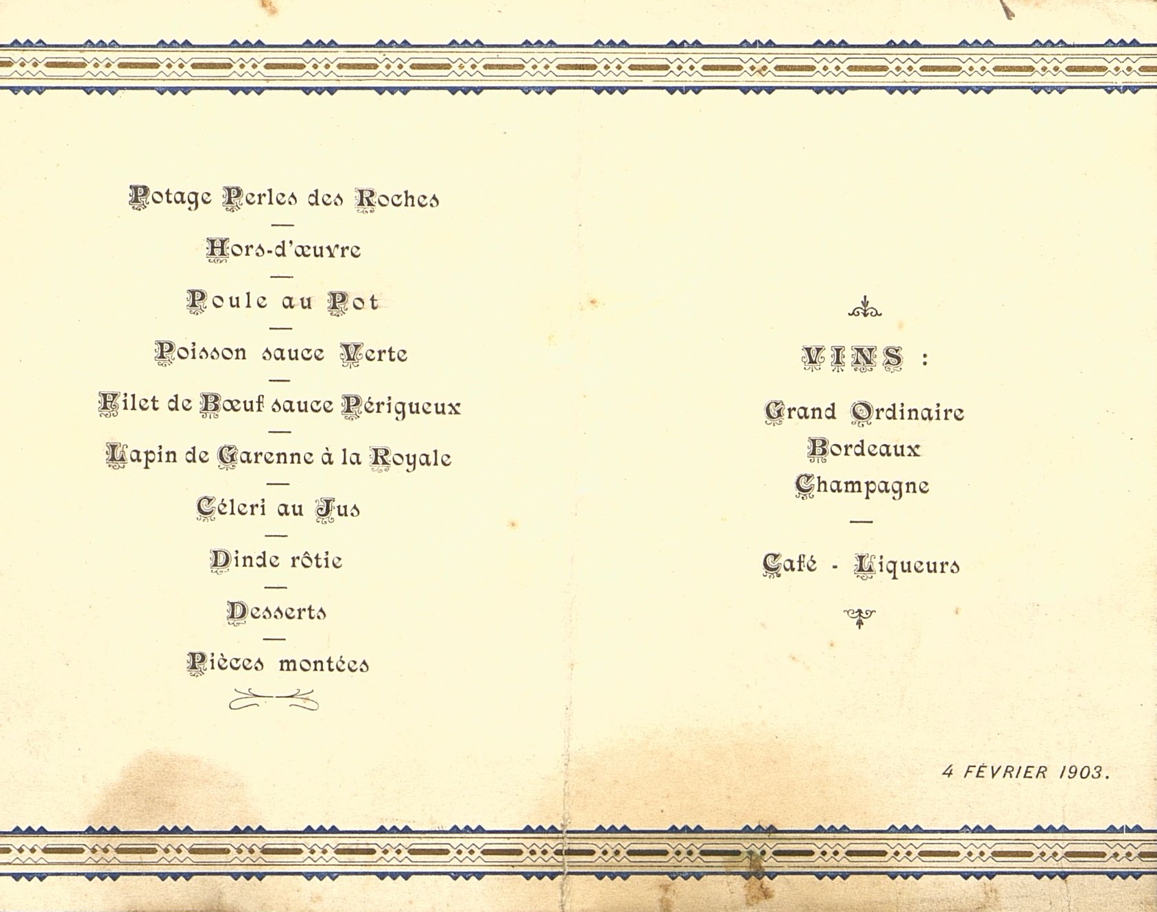 Plats servis : Potage Perles des Roches. Hors-d’œuvre. Poule au Pot. Poisson sauce Verte. Filet de Bœuf sauce Périgueux. Lapin de Garenne à la Royale. Céleri au Jus. Dinde rôtie. Desserts. Pièces montées.