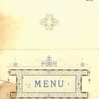 Illustration : bandeau haut et bas avec frise bleue et or à motifs triangulaires et oblongues . Cartel titre de même au recto. Menu pliant du 4 février 1903 au nom de Mme Gaillard.