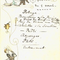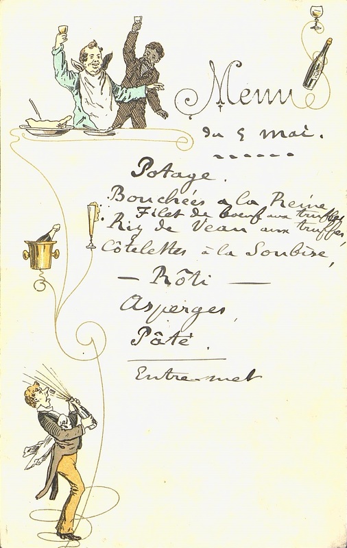 Menu du 5 mai en manuscrit illustré de dessins de personnages buveurs et ouverture d'une bouteille de champagne. Au dos, la répétition du même menu.