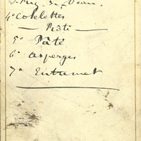Plats servis : Potage. Bouchées à la Reine. Filet de bœuf aux truffes. Ris de Veau aux truffes. Côtelettes à la Soubise. Rôti. Asperges. Pâté. Entremet.