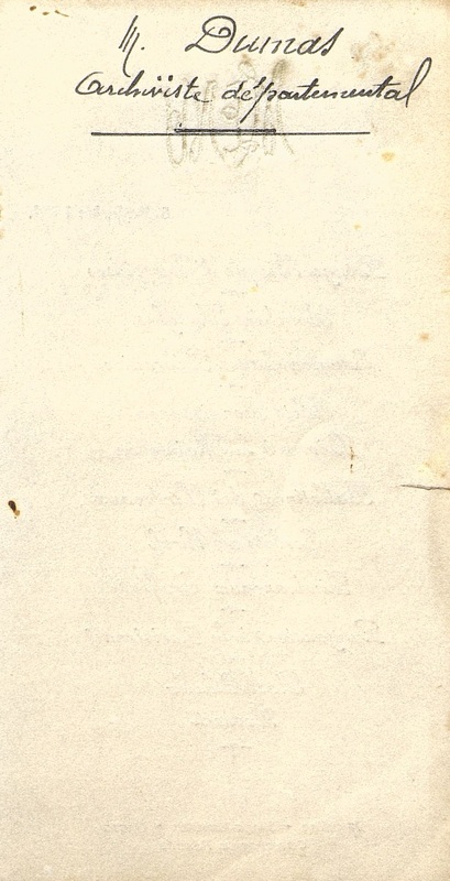 Titre en lettres en cordage. Monogramme H et E. Au verso en note manuscrite M. Dumas, archiviste départemental.
