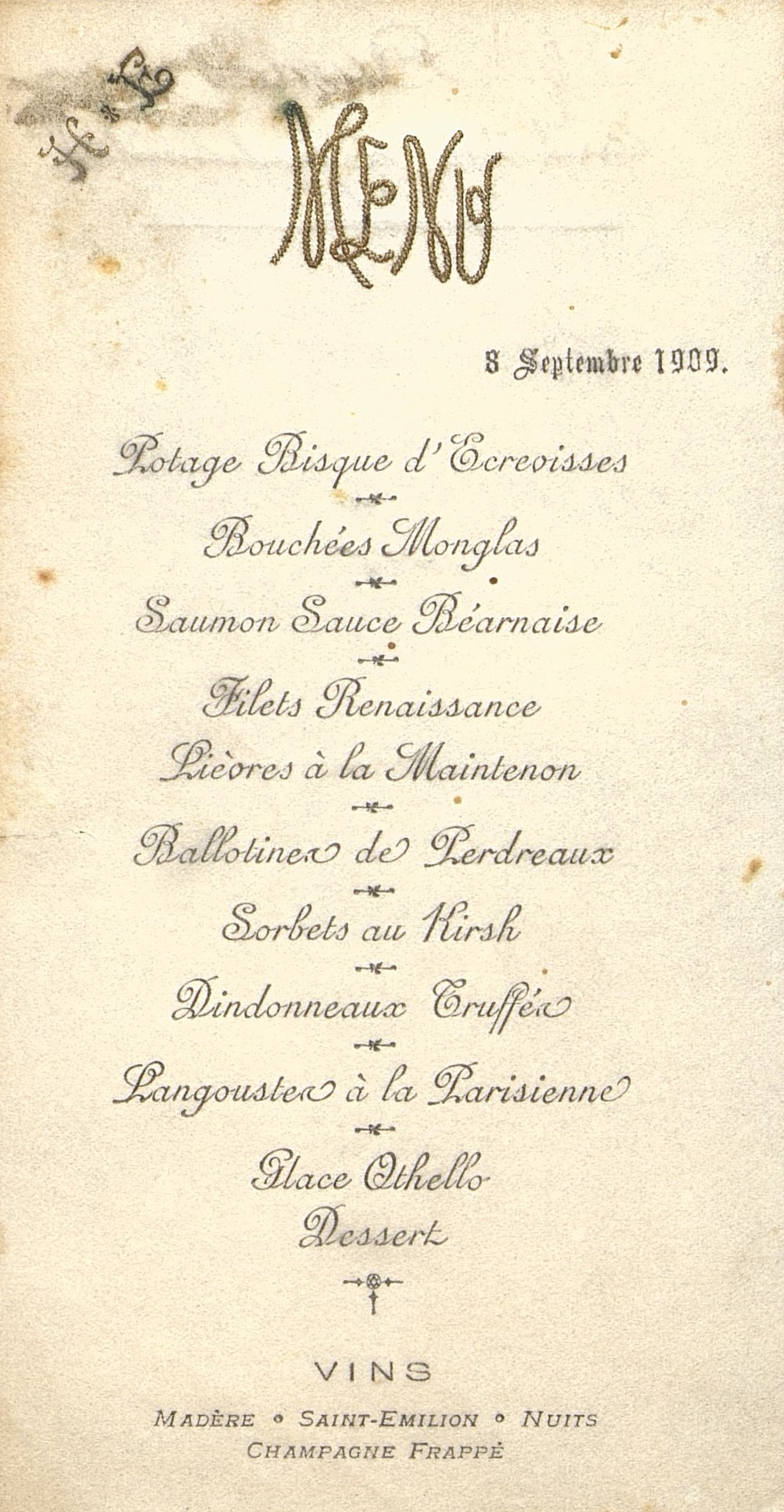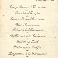 Plats servis : Potage Bisque d'Ecrevisses. Bouchées Monglas. Saumon Sauce Béarnaise. Filets Renaissance. Lièvre à la Maintenon. Ballotine de Perdreaux. Sorbets au Kirsch. Dindonneau truffés. Langouste à la Parisienne. Glace Othello. Dessert.
