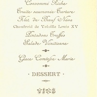 Plats servis : Consommé Riche. Truite saumonée Tartare. Filet de Bœuf Néva. Chaud-froid de Volaille Louis XV. Pintadons Truffés. Salade Vénitienne. Glace Comtesse Marie. Dessert.